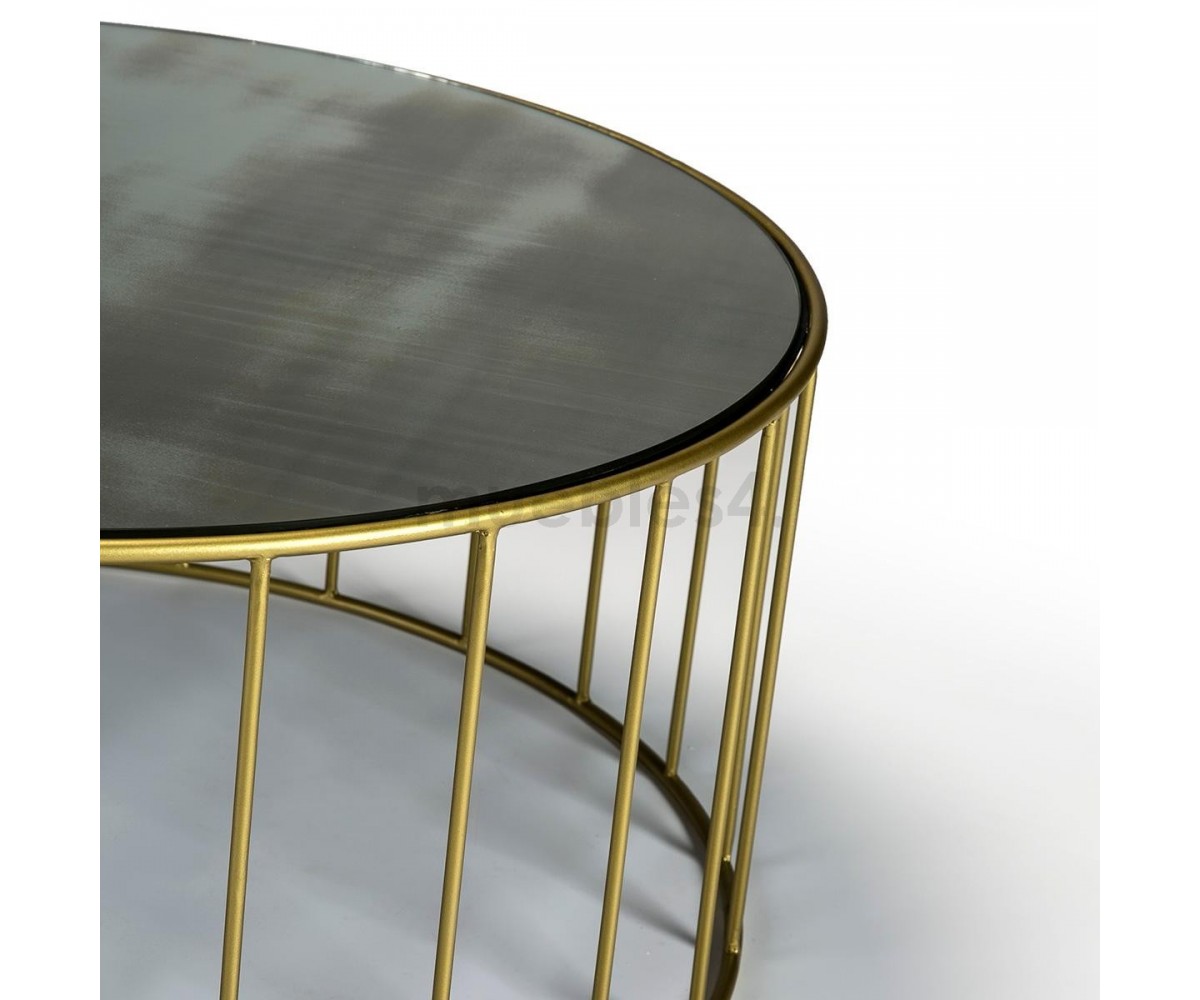 Mesa de centro inspirada en un diseño de Rodolfo Dordoni. Estructura fabriacada en acero tubular con triple lacado dorado, sobre circular en espejo envejecido. También disponible en mesa auxiliar. Réplica exacta con materiales originales de máxima calidad.