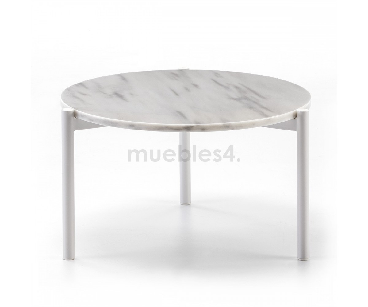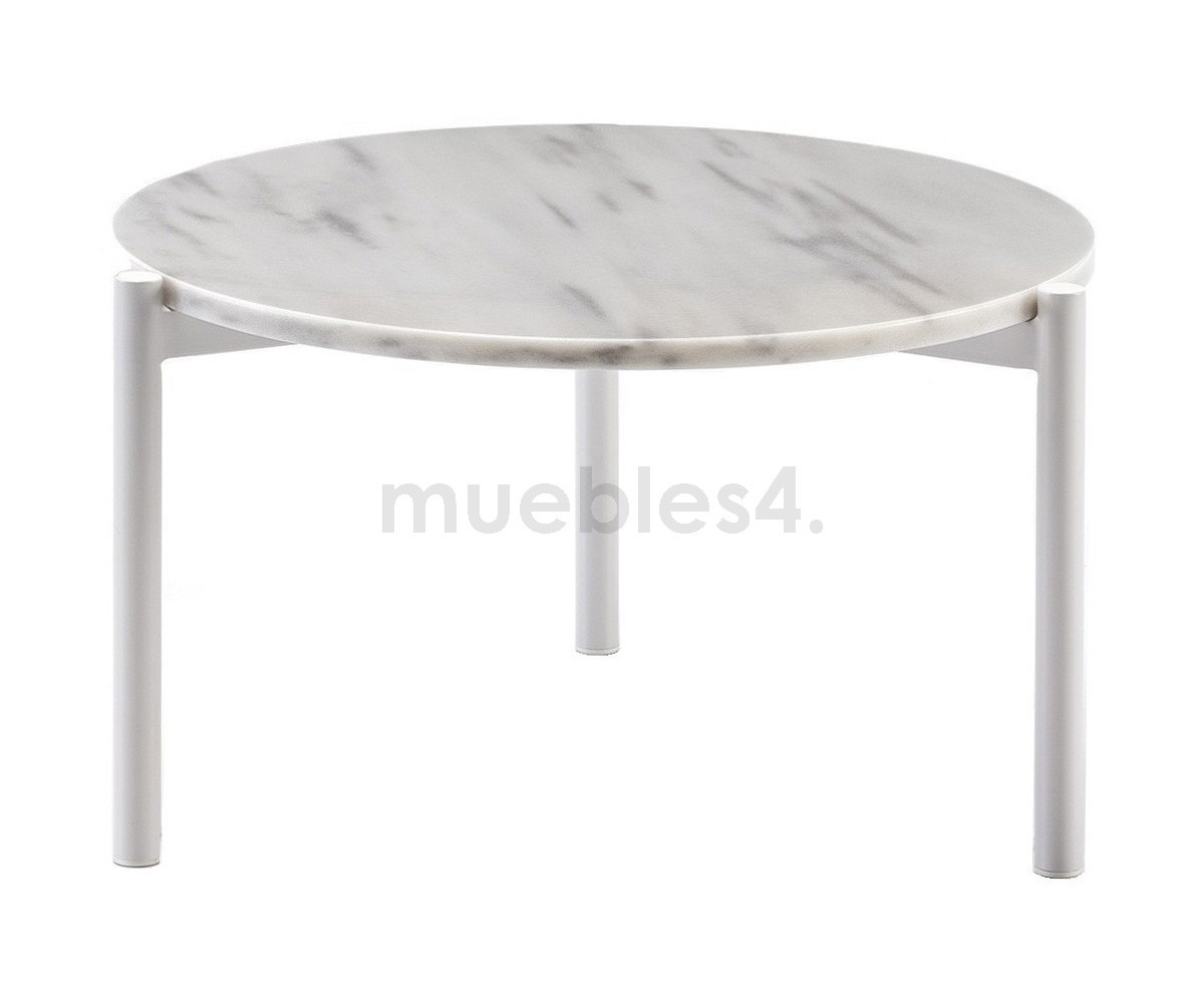 Mesa de centro Niobe 673, inspirada en un diseño de Federica Capitani. Estructura con patas en acero tubular con barras en acero cuatrado cruzadas, acabado triple lacado color blanco, tapa circular en mármol de carrara color blanco veteado. Réplica exacta con materiales originales de máxima calidad.