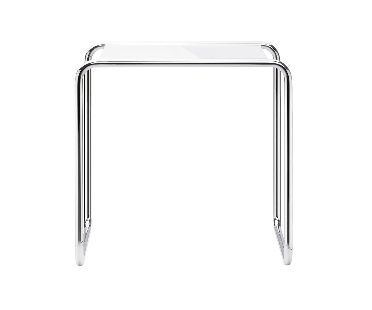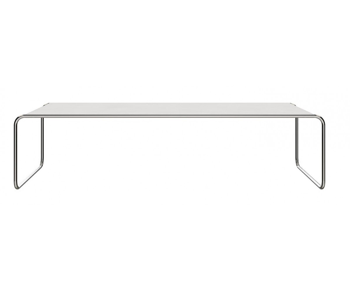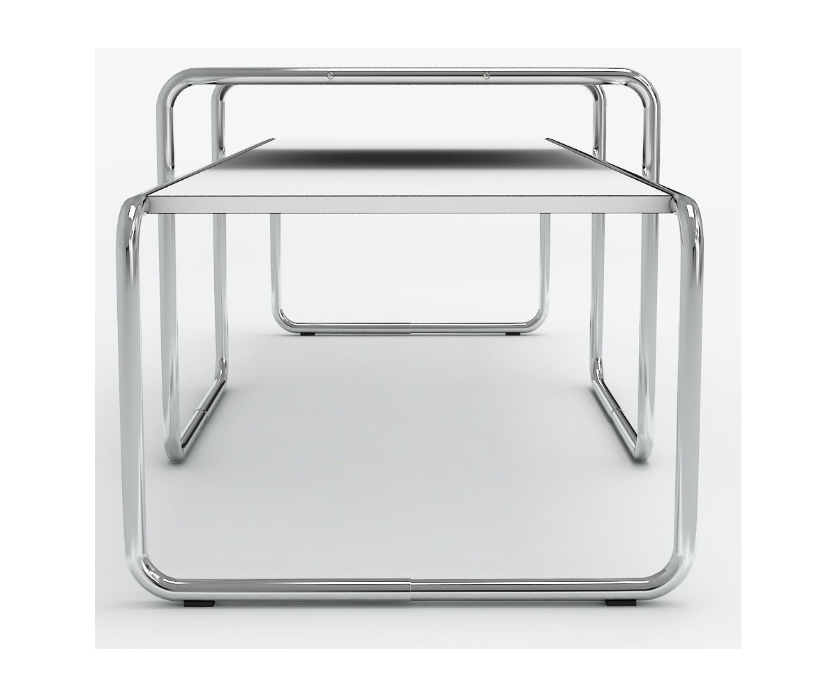 Mesa inspirada en un diseño de Marcel Breuer. Conjunto de 2 mesas que podrás utilizar de forma individual o agrupadas, ya que la pequeña encaja sobre la mesa más baja y alargada, creando un conjunto elegante y sofisticado. Marcel Breuer era un aprendiz de Bauhaus en 1925, concibió esta mesita baja como compañera de la silla Wassily, el primer diseño de tubo de acero, inspirada en el marco de tubo de una bicicleta. El tablero presenta un acabado satinado, laminado plástico liso en colores negro, blanco o rojo.