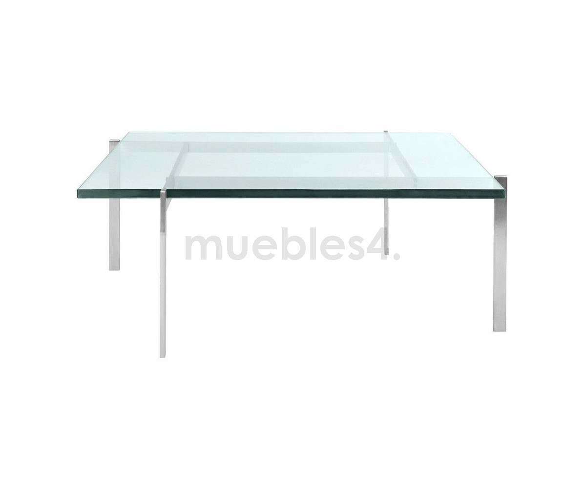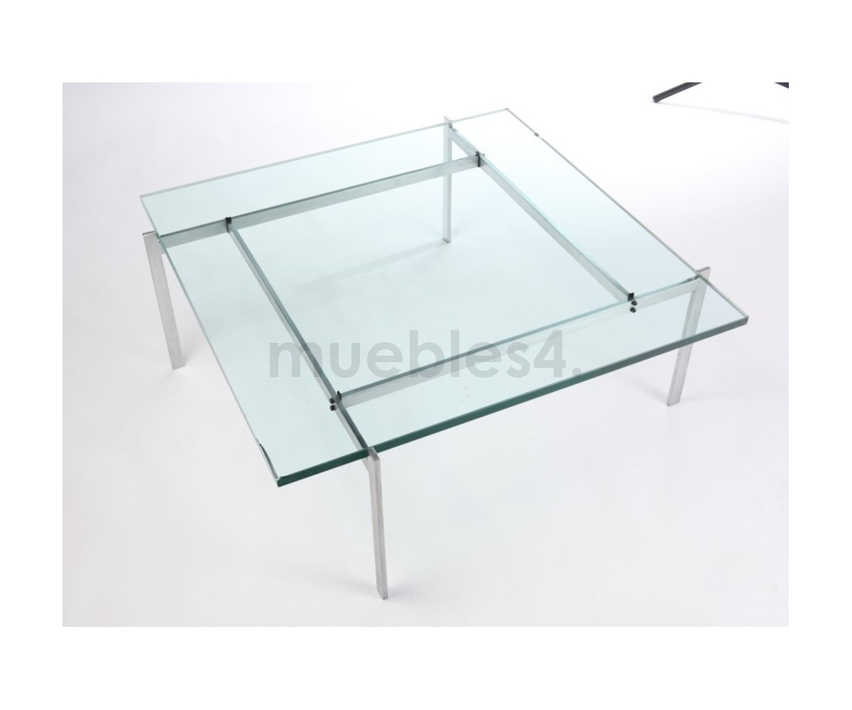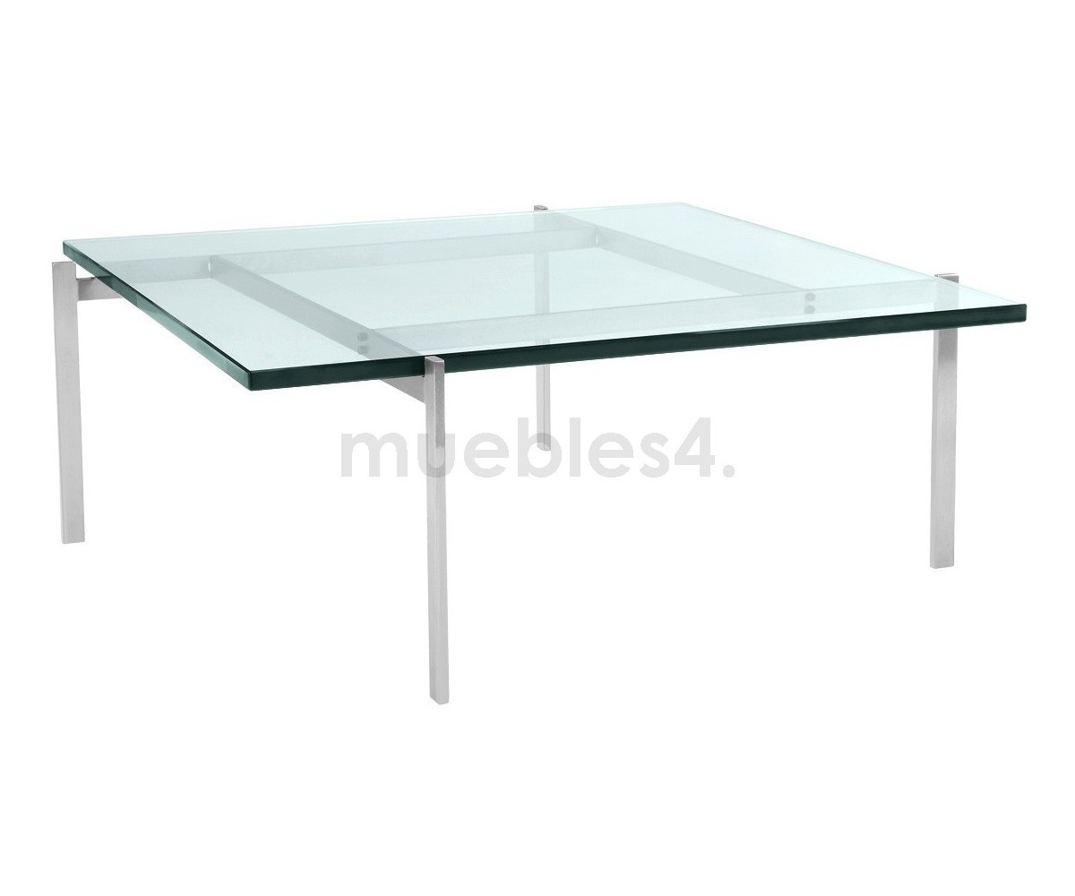 Mesa de centro cuadrada inspirada en un diseño de Poul Kjaerholm. Estructura realizada en pletina acero cromo terminación brillo, tapa en cristal templado de 15mm. de espesor. Réplica exacta con materiales originales de máxima calidad.