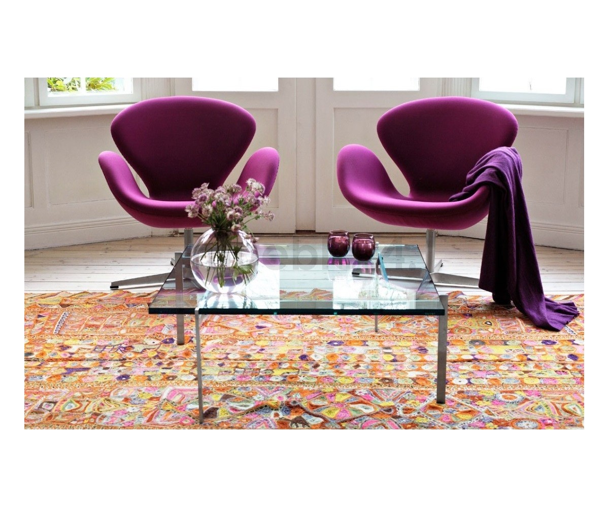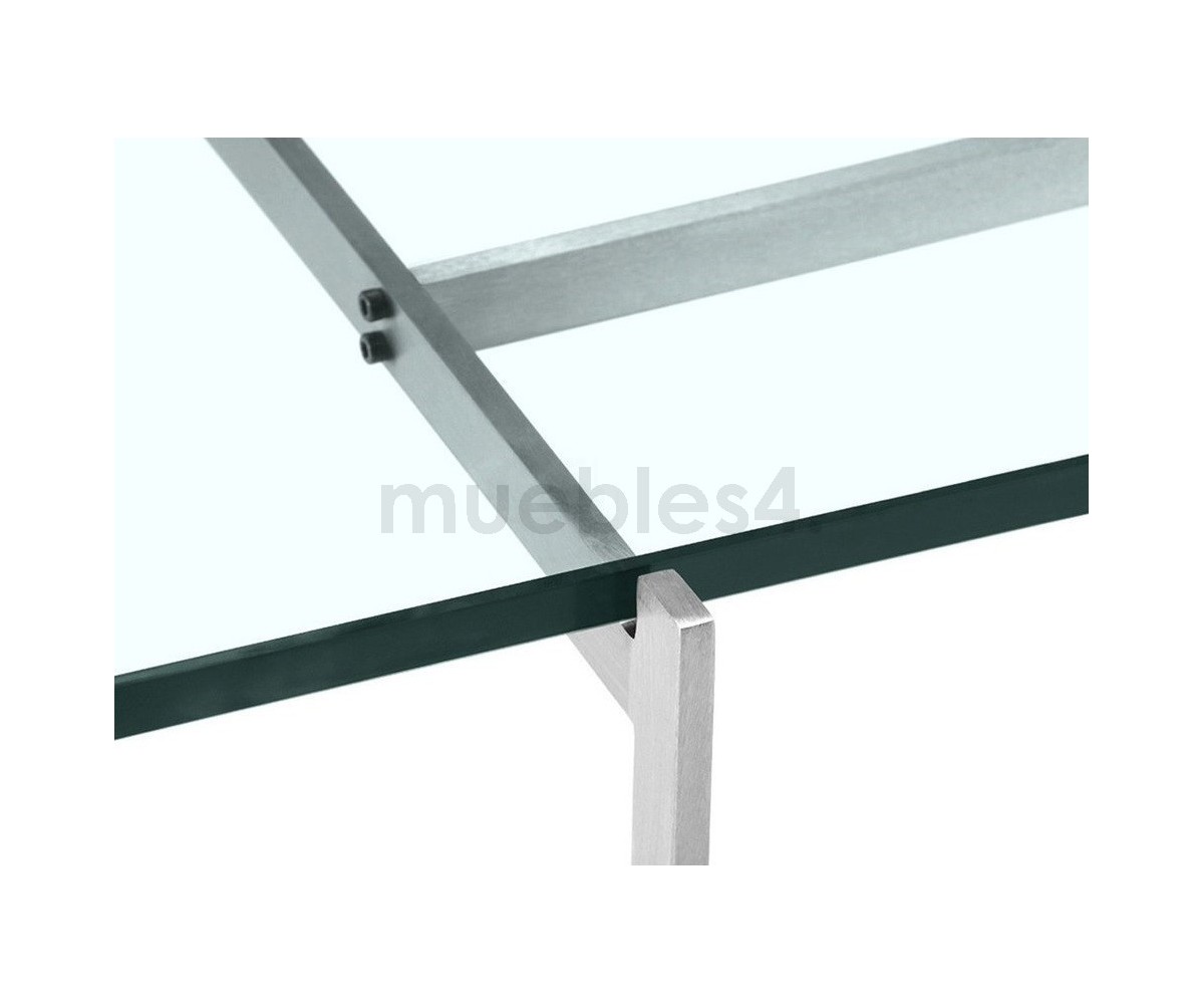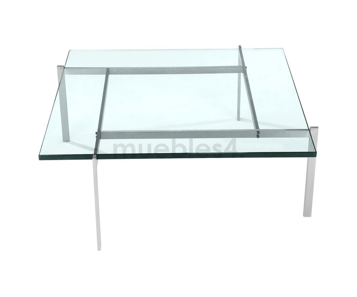 Mesa de centro cuadrada inspirada en un diseño de Poul Kjaerholm. Estructura realizada en pletina acero cromo terminación brillo, tapa en cristal templado de 15mm. de espesor. Réplica exacta con materiales originales de máxima calidad.