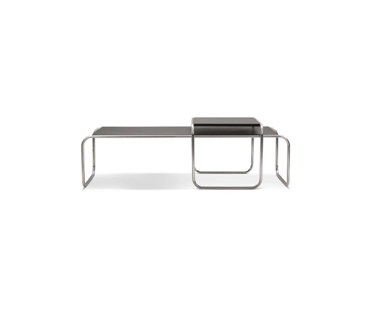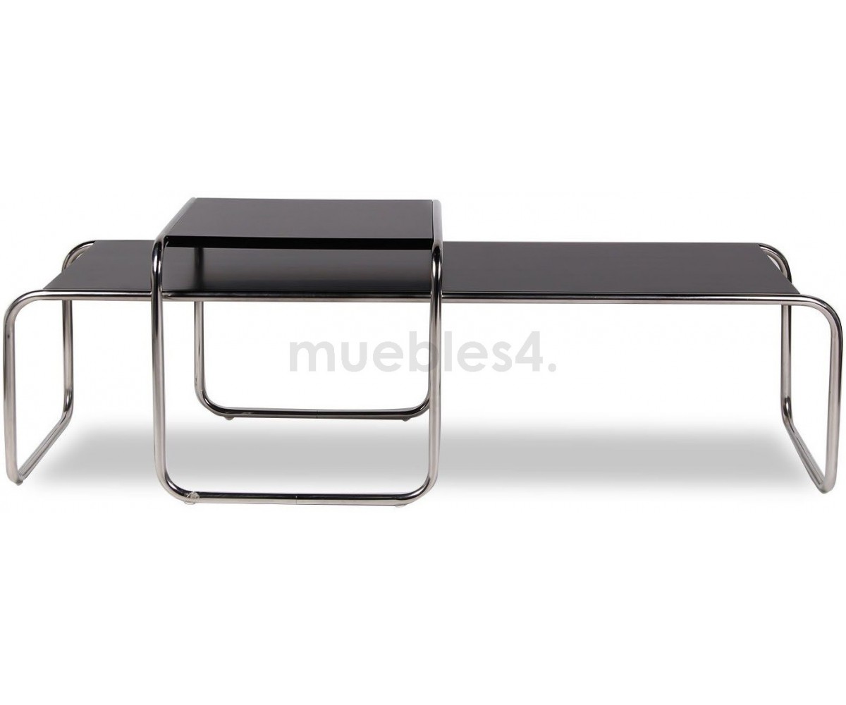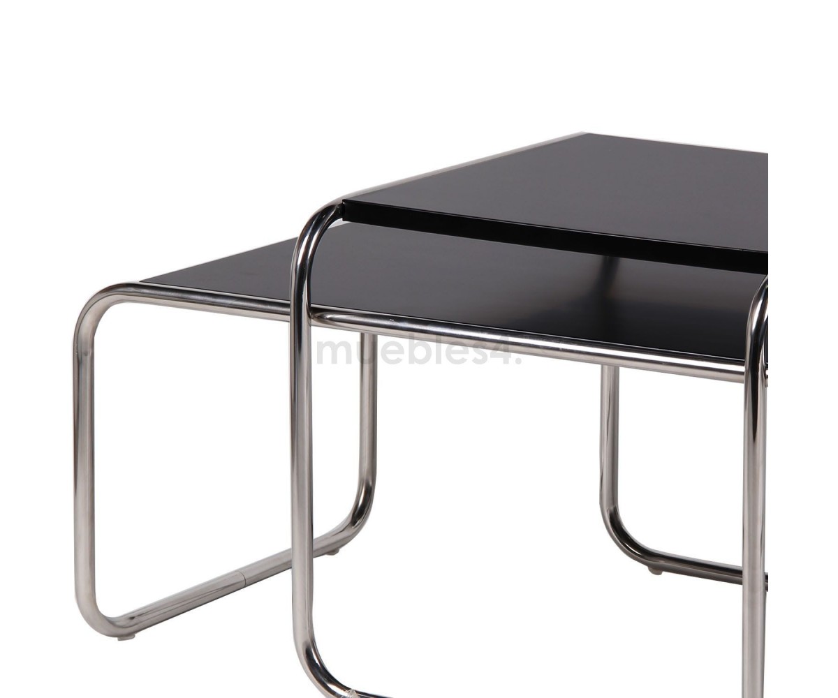 Mesa inspirada en un diseño de Marcel Breuer. Conjunto de 2 mesas que podrás utilizar de forma individual o agrupadas, ya que la pequeña encaja sobre la mesa más baja y alargada, creando un conjunto elegante y sofisticado. Marcel Breuer era un aprendiz de Bauhaus en 1925, concibió esta mesita baja como compañera de la silla Wassily, el primer diseño de tubo de acero, inspirada en el marco de tubo de una bicicleta. El tablero presenta un acabado satinado, laminado plástico liso en colores negro, blanco o rojo.