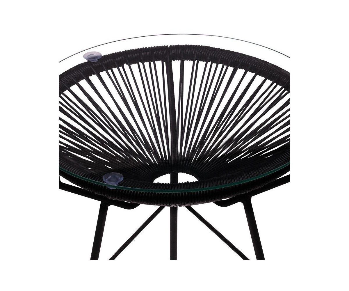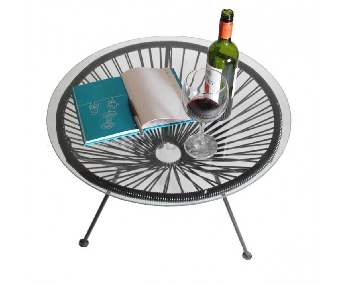 Mesa de centro circular hecha a mano por artesanos, inspirado en un diseño de Ok Design. Estructura fabricada en acero tubular lacado al horno epoxi terminación color negro de 12mm., tapa en cristal templado transparente de 5mm, de espesor, tiras de pvc color blanco o negro de 4mm. Réplica exacta con materiales originales de máxima calidad.