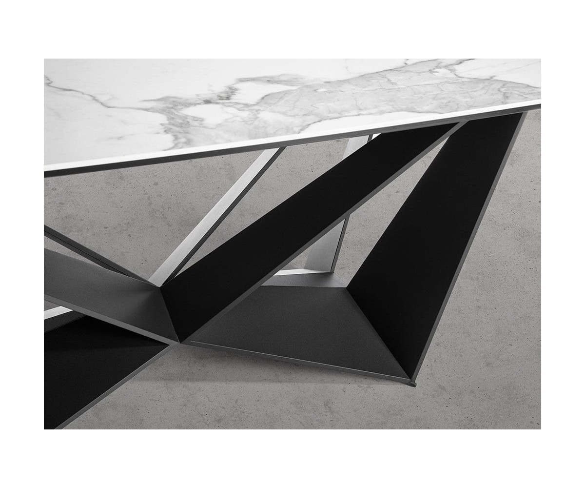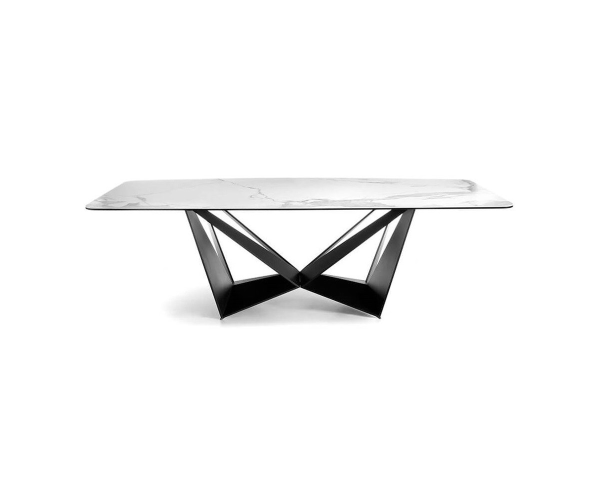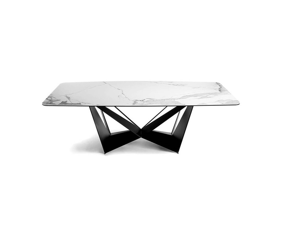 Mesa de comedor ovalada barril, inspirado en un diseño de Andrea Lucatello para Cattelan Italia. Base en acero inoxidable de 22 micras lacado epoxi color negro, tapa fija de mármol porcelánico de 6mm de grosor, sobre cristal negro de 8mm. OPCIONES BASE EN ACERO INOXIDABLE, CONSULTAR. Réplica exacta con materiales originales de máxima calidad.