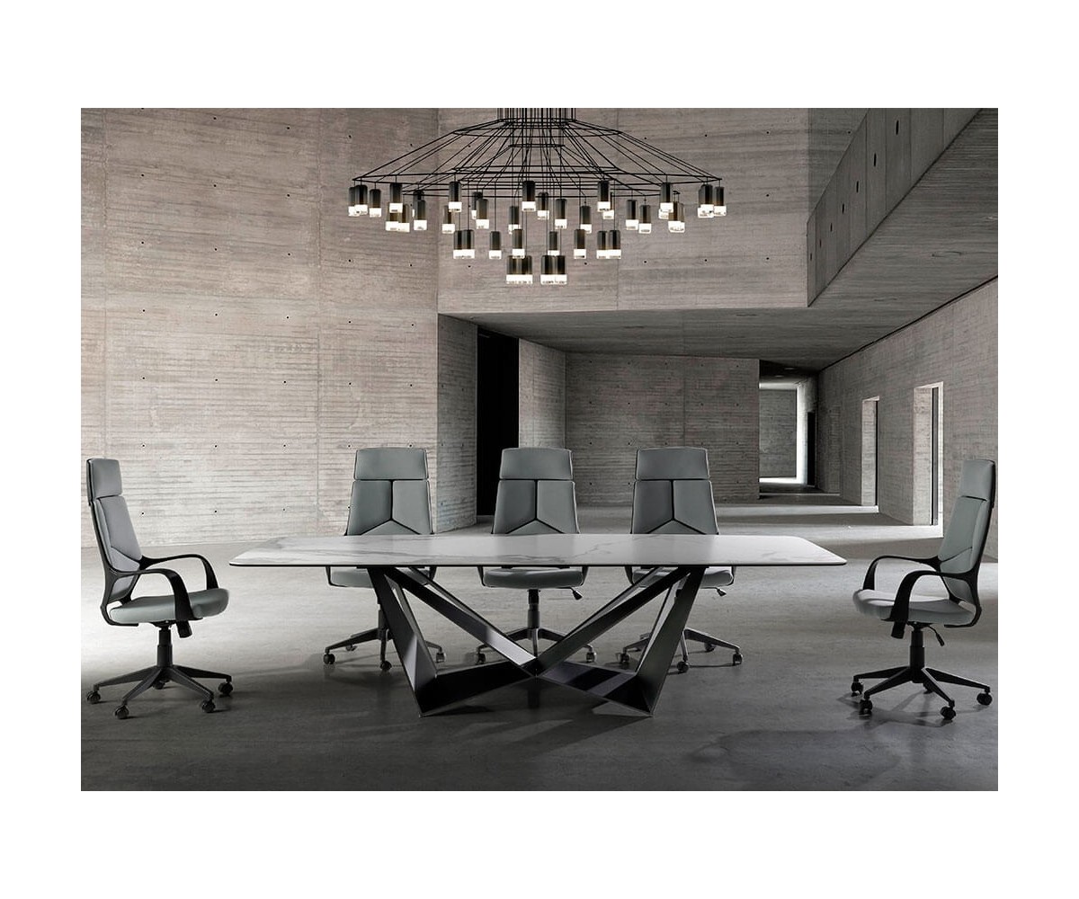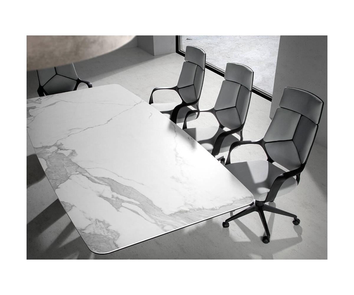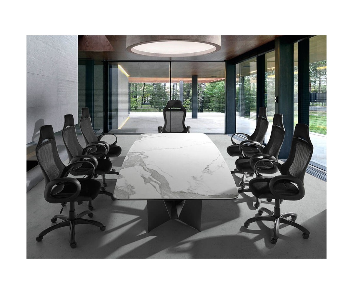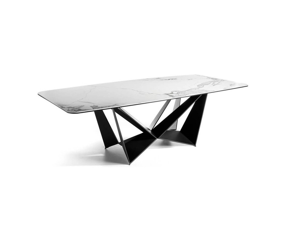 Mesa de comedor ovalada barril, inspirado en un diseño de Andrea Lucatello para Cattelan Italia. Base en acero inoxidable de 22 micras lacado epoxi color negro, tapa fija de mármol porcelánico de 6mm de grosor, sobre cristal negro de 8mm. OPCIONES BASE EN ACERO INOXIDABLE, CONSULTAR. Réplica exacta con materiales originales de máxima calidad.