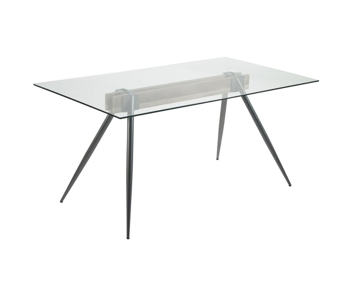 Mesa de comedor rectangular inspirada en un diseño de Enzo Mari para Driade. Tapa en cristal templado. Patas de forma de aguja en acero acabado triple lacado color negro, reforzada por travesaño de acero efecto madera natural. Réplica exacta con materiales originales de máxima calidad.
