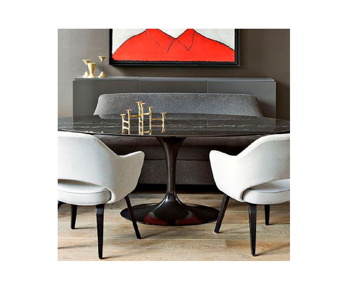 Mesa de comedor ovalada inspirada en un diseño de Eero Saarinen. Base de aluminio lacado en color negro con terminación brillo, sobre en mármol de carrara con canto biselado, al tratarse de piedra natural puede variar el tono y dibujo. Otras medidas consultar. Réplica exacta con materiales originales de máxima calidad.