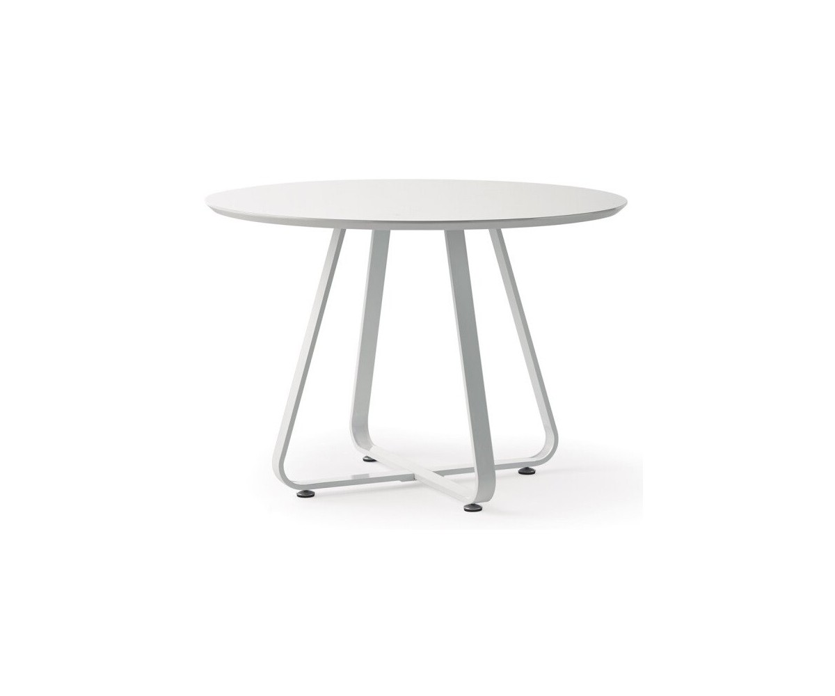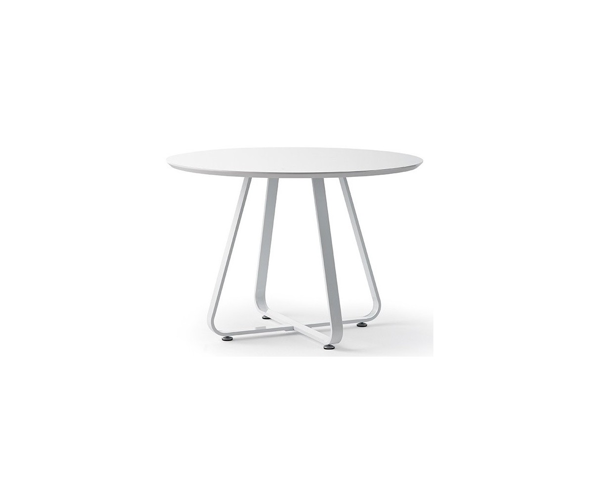 Mesa comedor circular, inspirada en un diseño de Midj. Estructura en pletina acero lacada al horno terminación color blanco. Sobre en madera de haya lacado en color blanco. Peso del producto 11 kg. Réplica con materiales originales de máxima calidad.