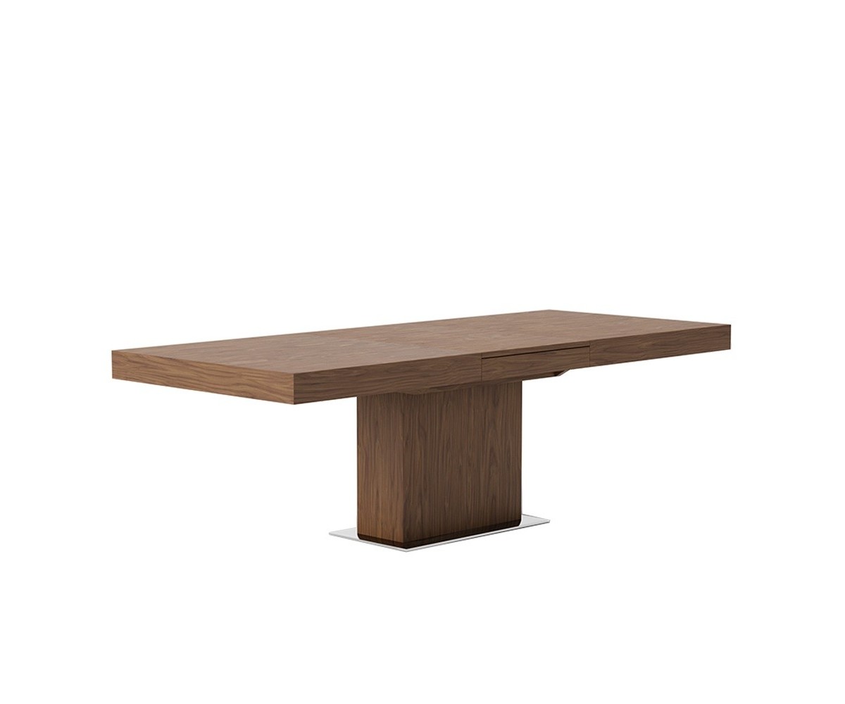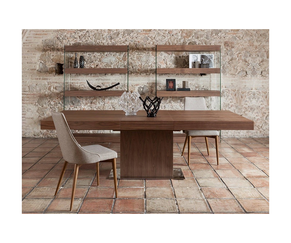 Mesa de comedor rectangular y extensible inspirada en un diseño de Modloft. Tapa fija y columna central de madera chapada en nogal natural de 0,5mm de espesor. Gracias a su dos extensibles de 45cm, disfrutarás de una mesa totalmente versátil y funcional que podrás adaptar según el número de invitados. Base en acero cromado terminación brillo. Réplica con materiales originales de máxima calidad.
