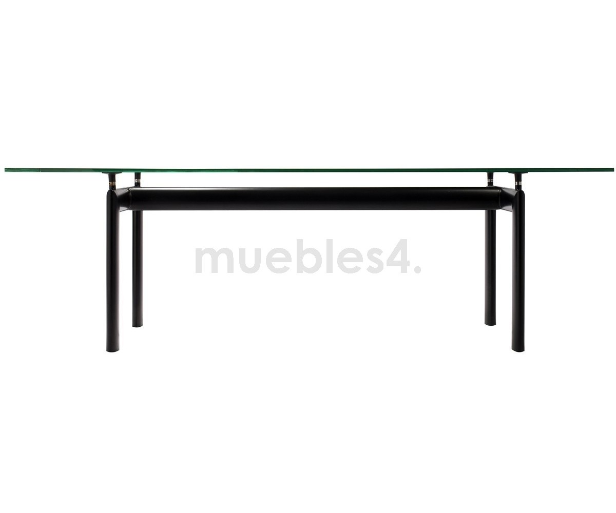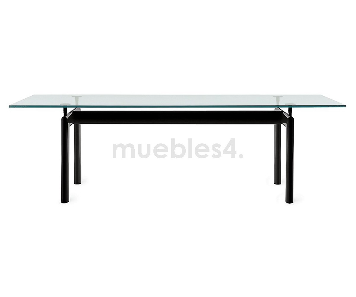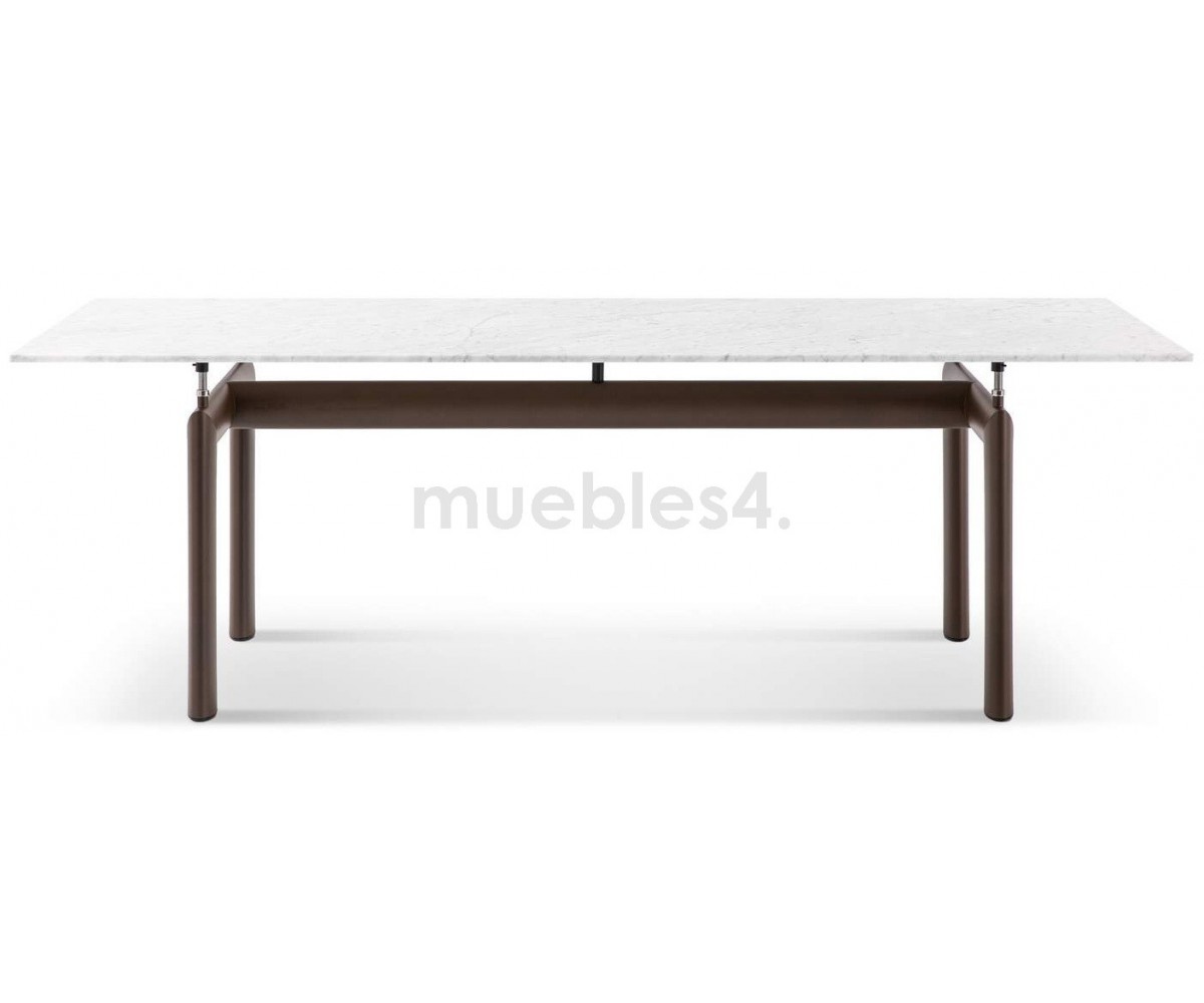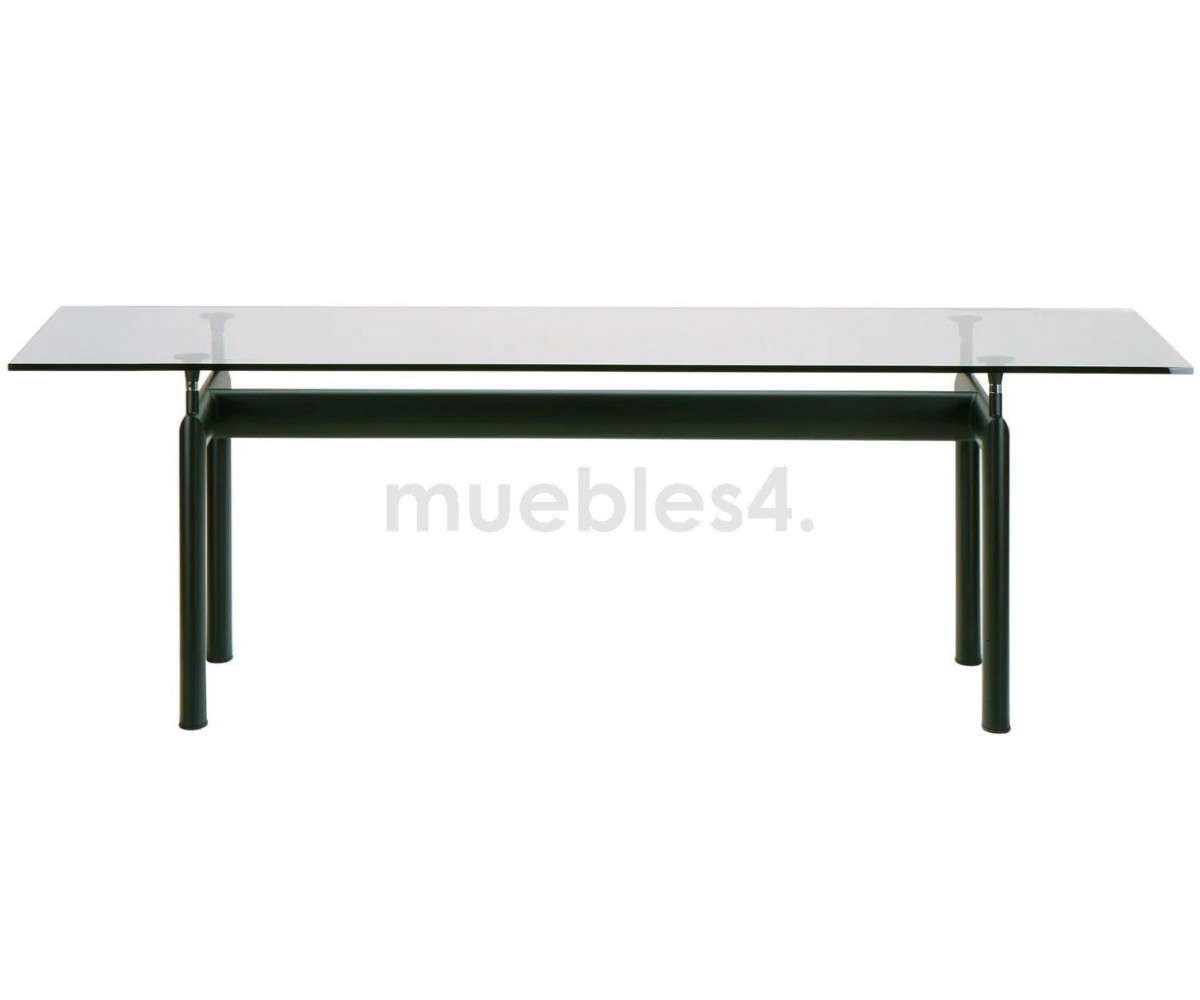 Mesa de comedor inspirada en un diseño de Le Corbusier y Charlotte Perriand. Un diseño icónico de un maestro de la arquitectura moderna, la mesa LC6 expresa una distinción dinámica entre su base portante y el tablero que se apoya. Mesa es completamente autónoma, lo que se realza con la adición de cuatro piezas de soporte centrales que ajustan la altura y mantienen el delgado tablero rectangular en su lugar sobre su pesada base.
