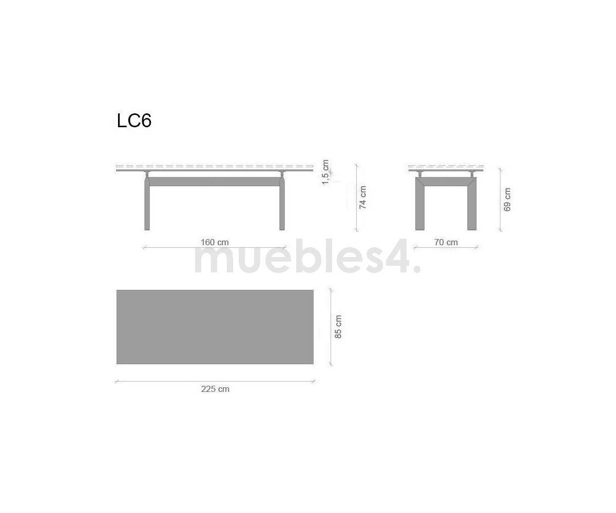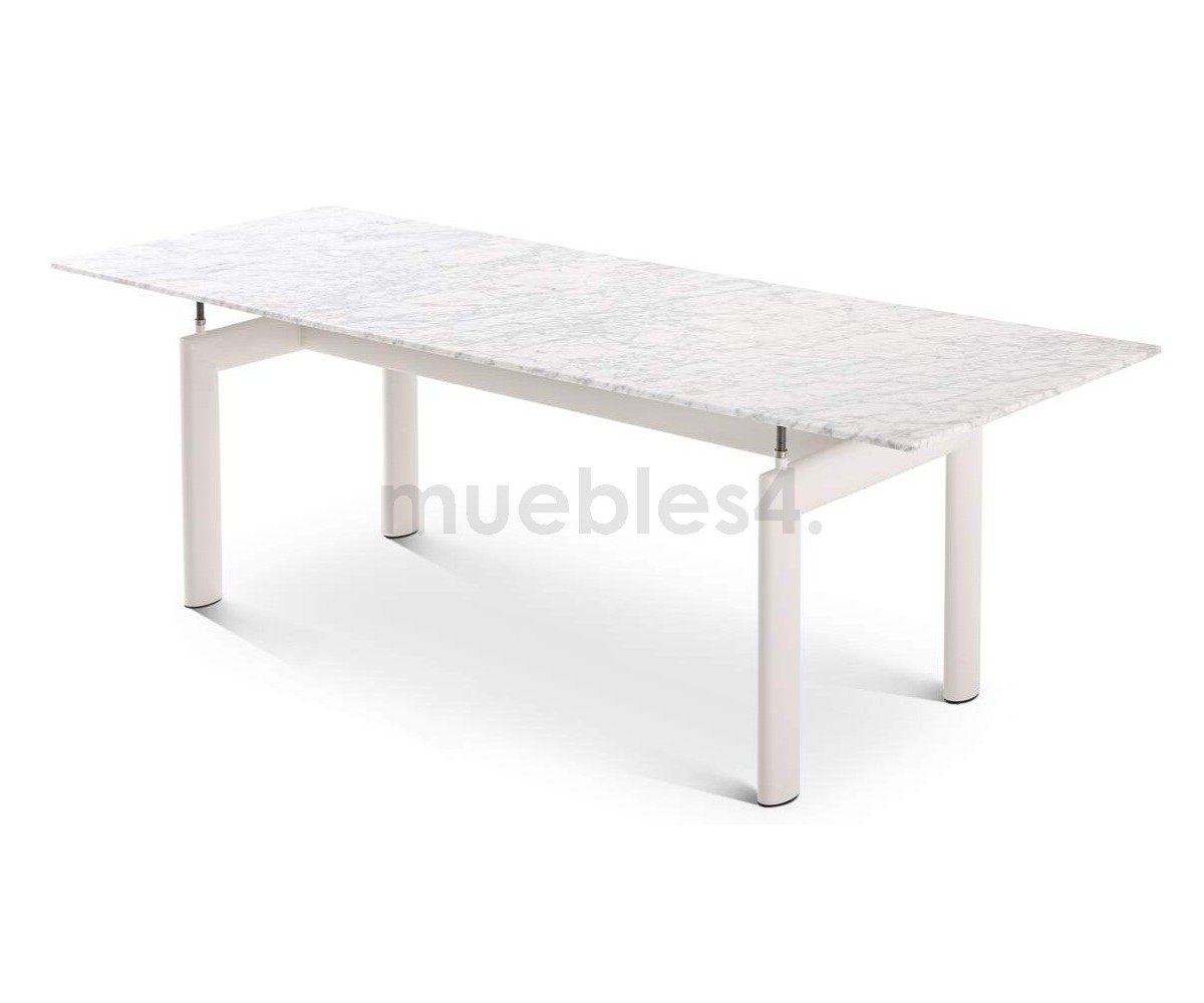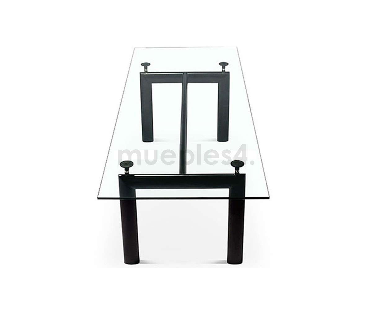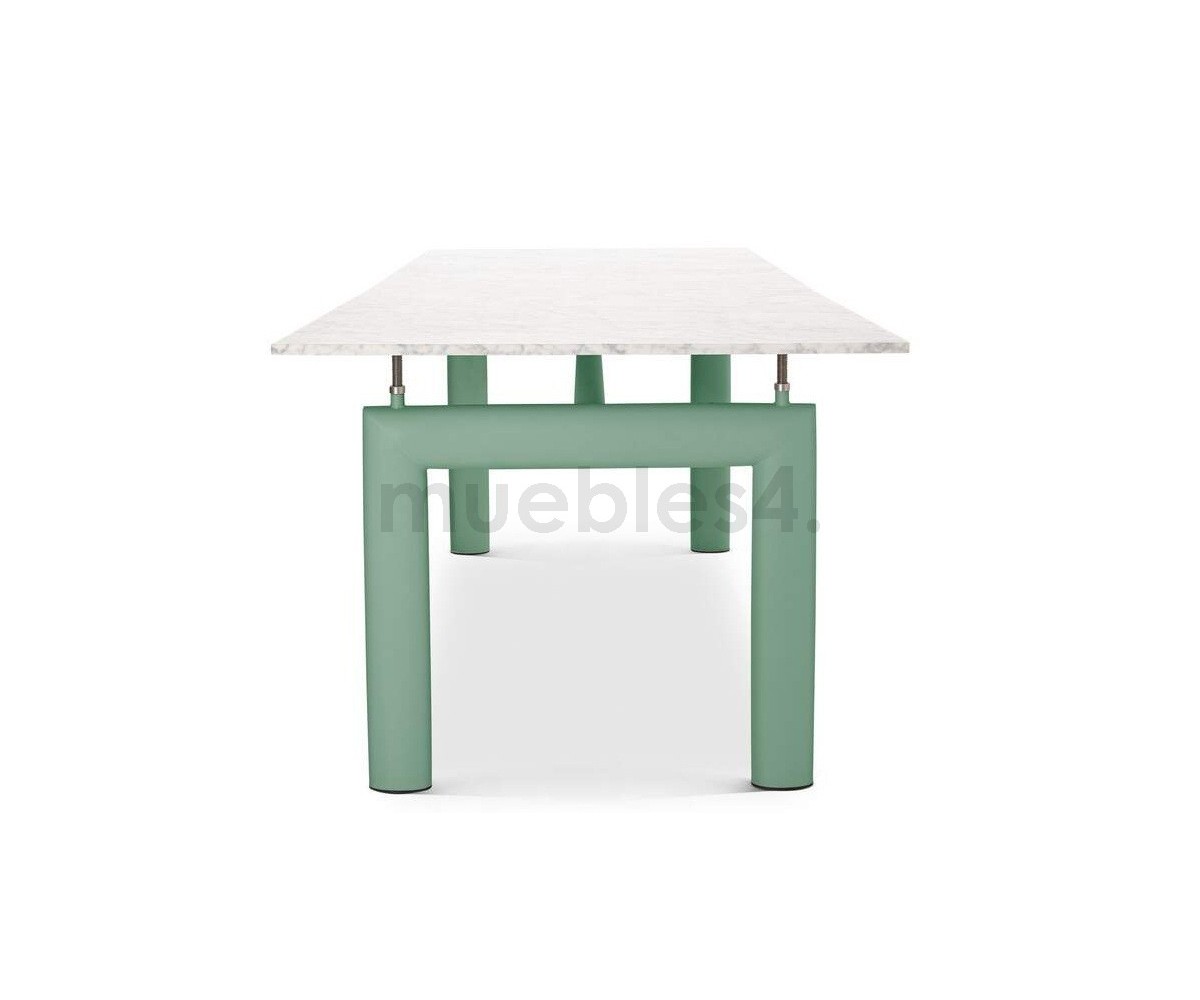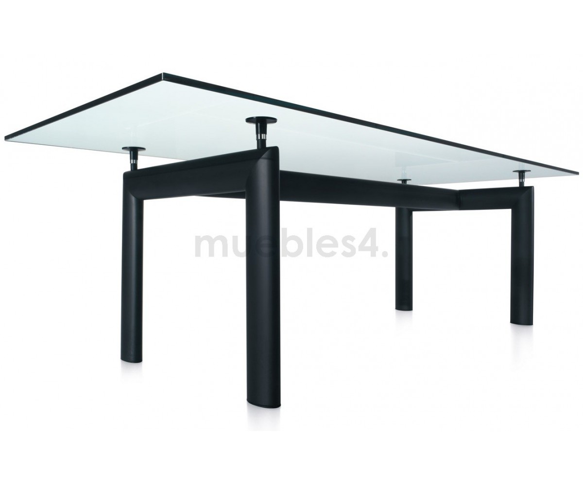 Mesa de comedor inspirada en un diseño de Le Corbusier y Charlotte Perriand. Un diseño icónico de un maestro de la arquitectura moderna, la mesa LC6 expresa una distinción dinámica entre su base portante y el tablero que se apoya. Mesa es completamente autónoma, lo que se realza con la adición de cuatro piezas de soporte centrales que ajustan la altura y mantienen el delgado tablero rectangular en su lugar sobre su pesada base.