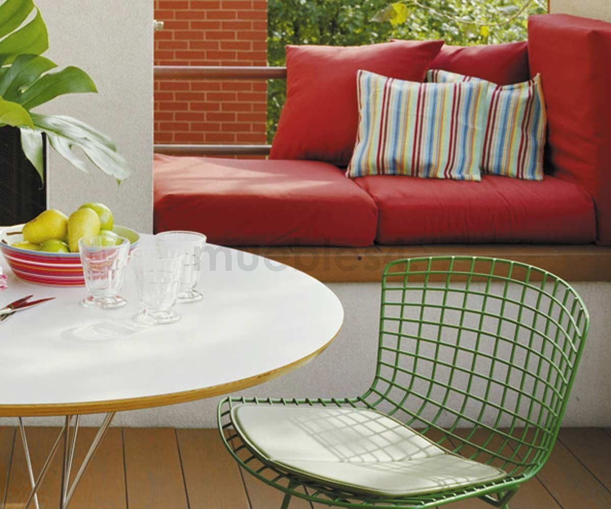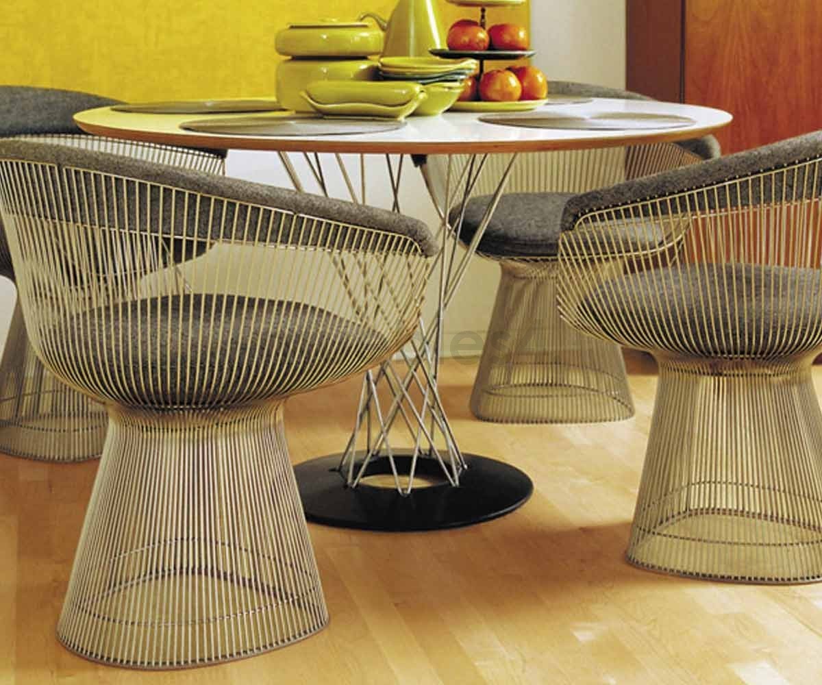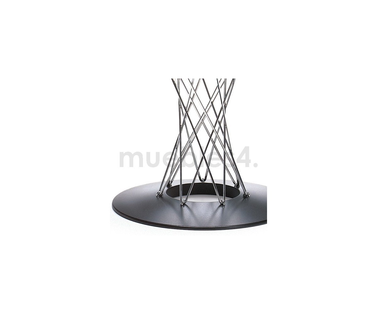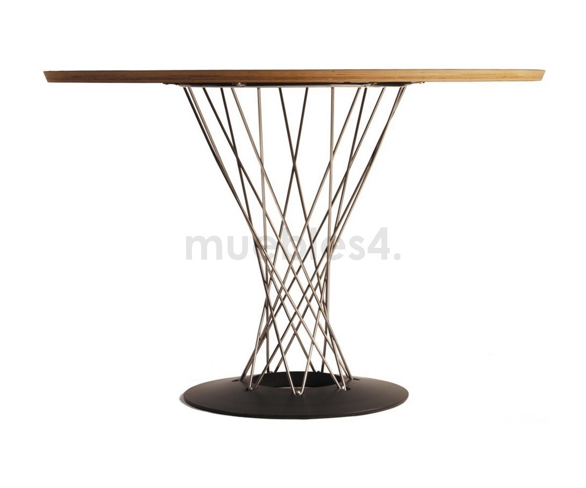 Mesa circular de comedor inspirada en un diseño Isamu Noguchi. Estructura mediante barillas en acero cromado termianción brillo, base circular en acero lacado color negro, sobre circular en madera de roble lacado color blanco con canto biselado natural. Réplica exacta con materiales originales de máxima calidad.