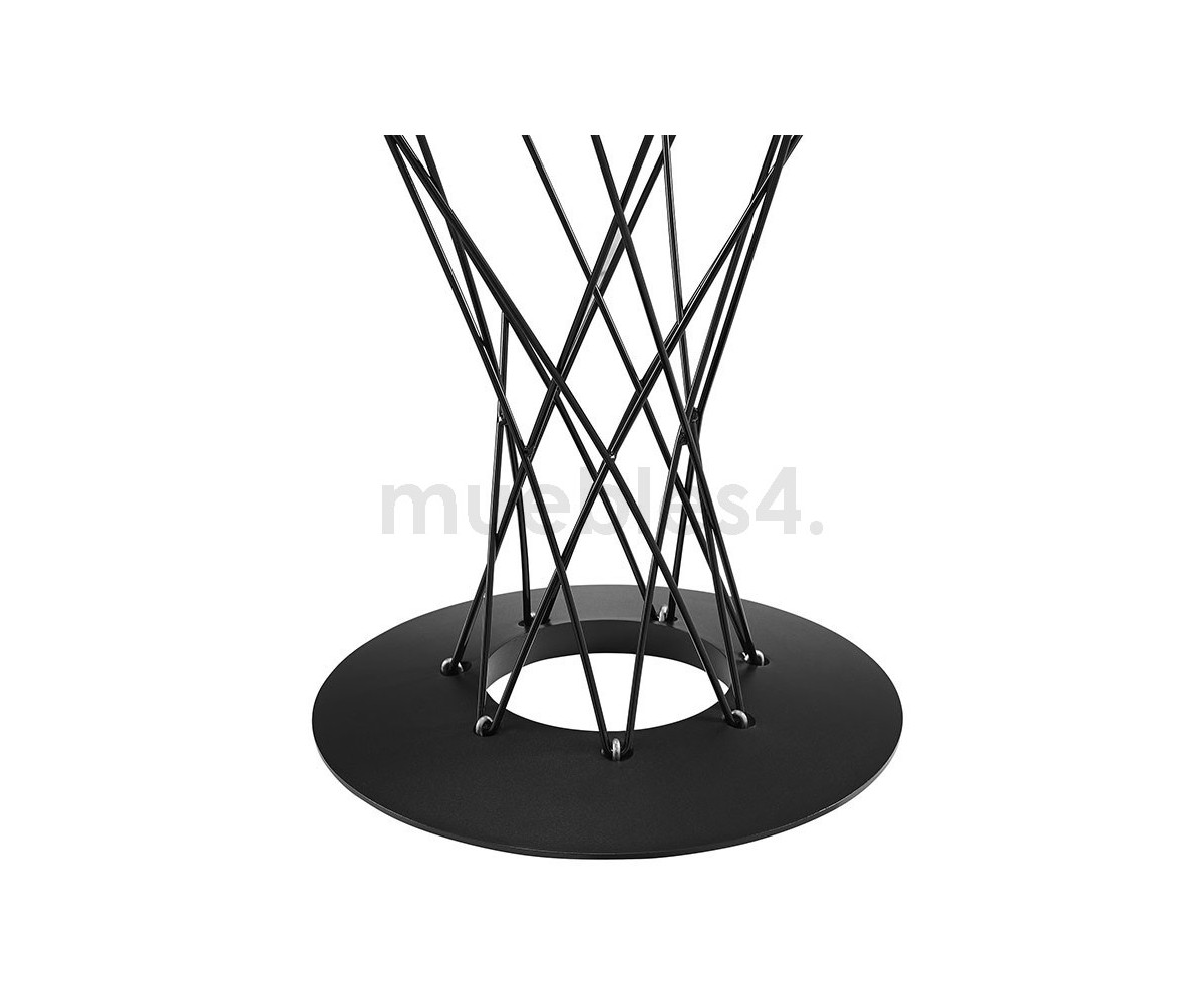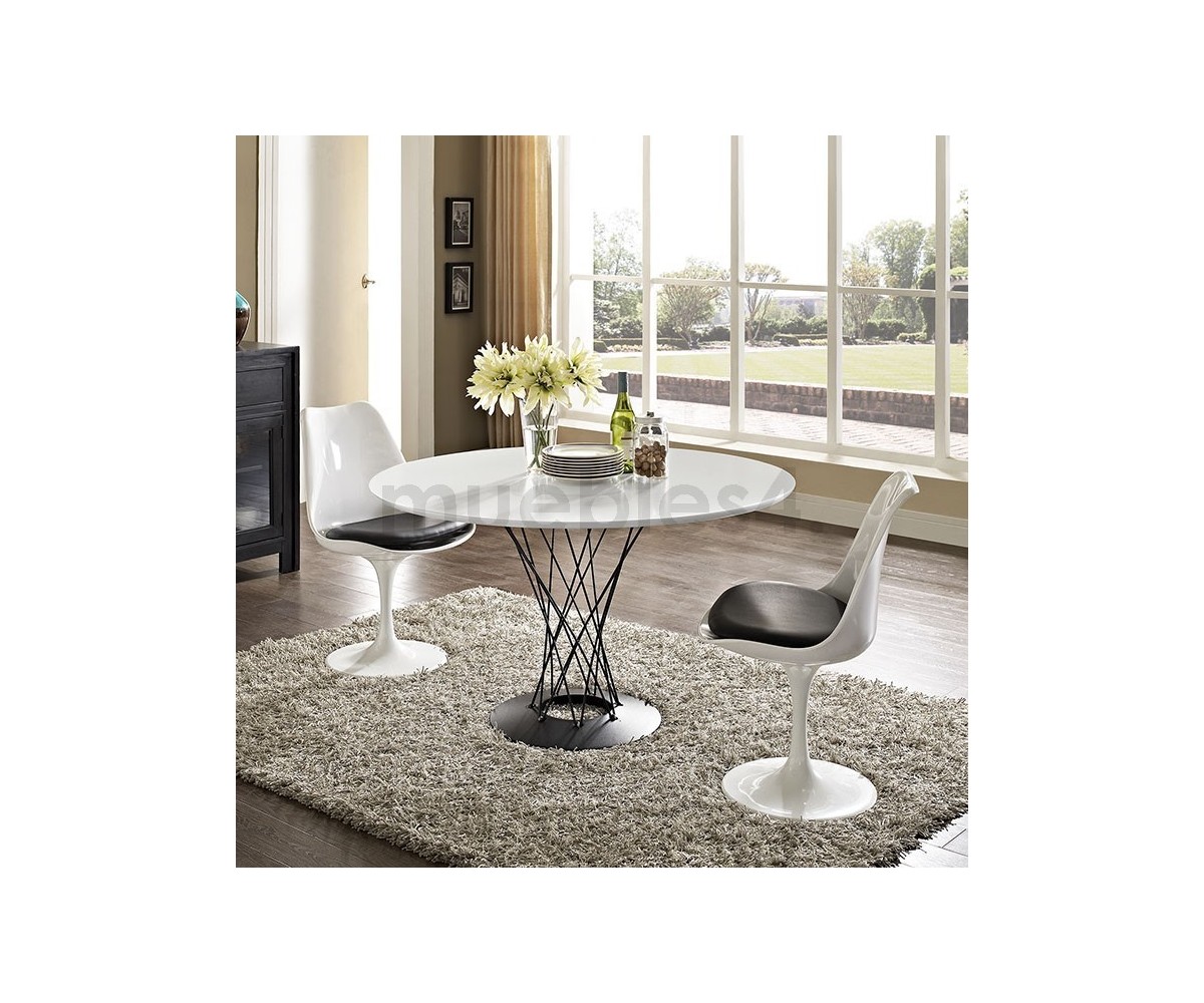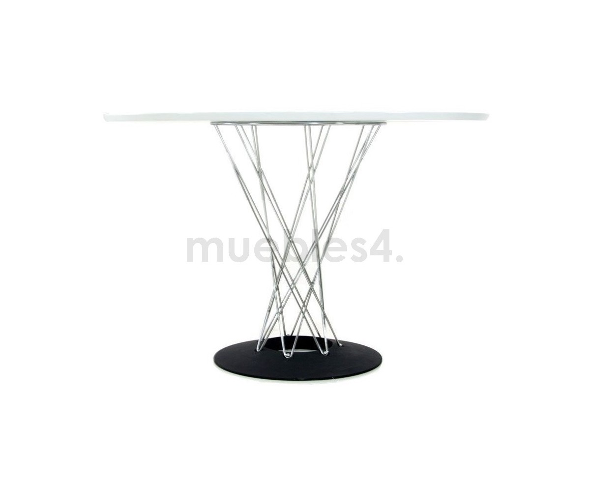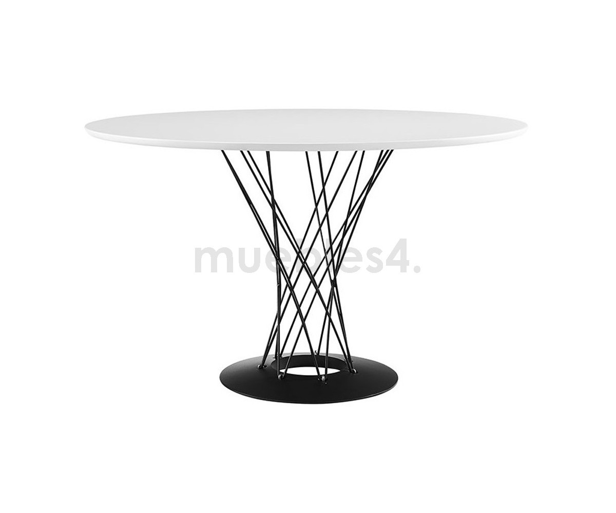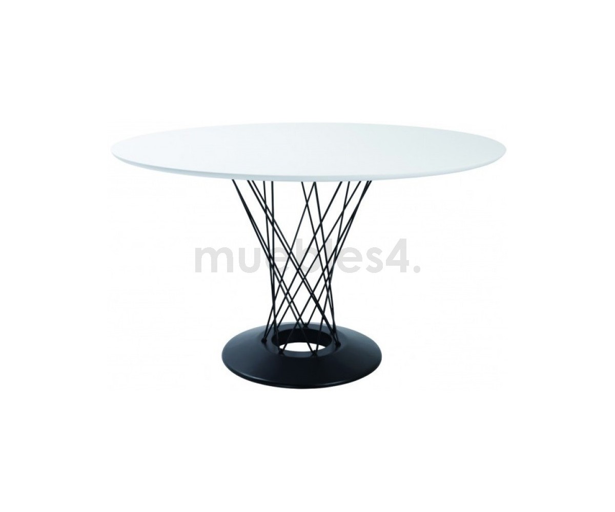 Mesa circular de comedor inspirada en un diseño Isamu Noguchi. Estructura mediante barillas en acero cromado termianción brillo lacadas en color negro, base circular en acero lacado color negro, sobre circular en madera de roble lacado color blanco con canto biselado. Réplica exacta con materiales originales de máxima calidad.