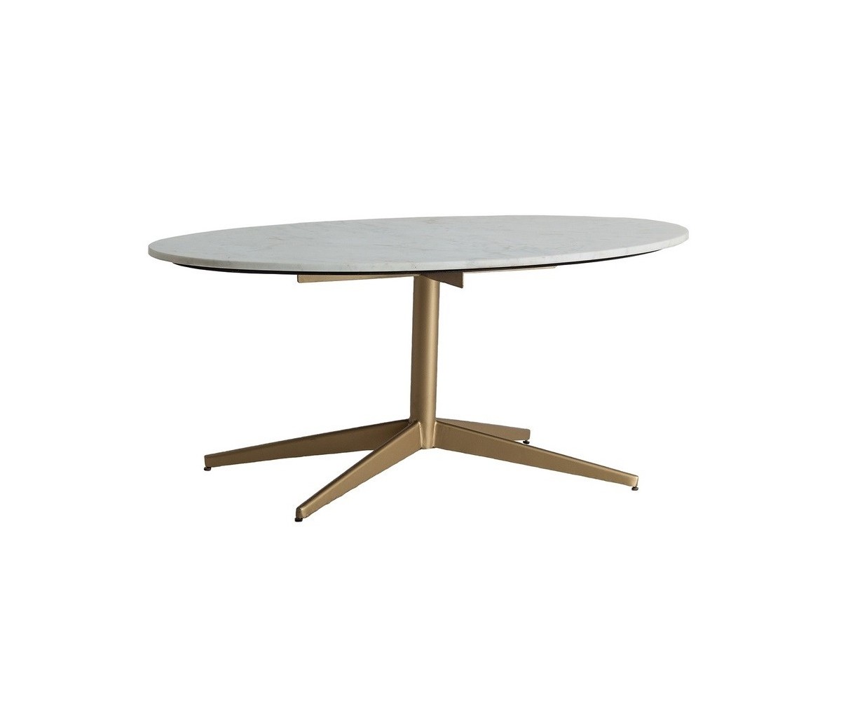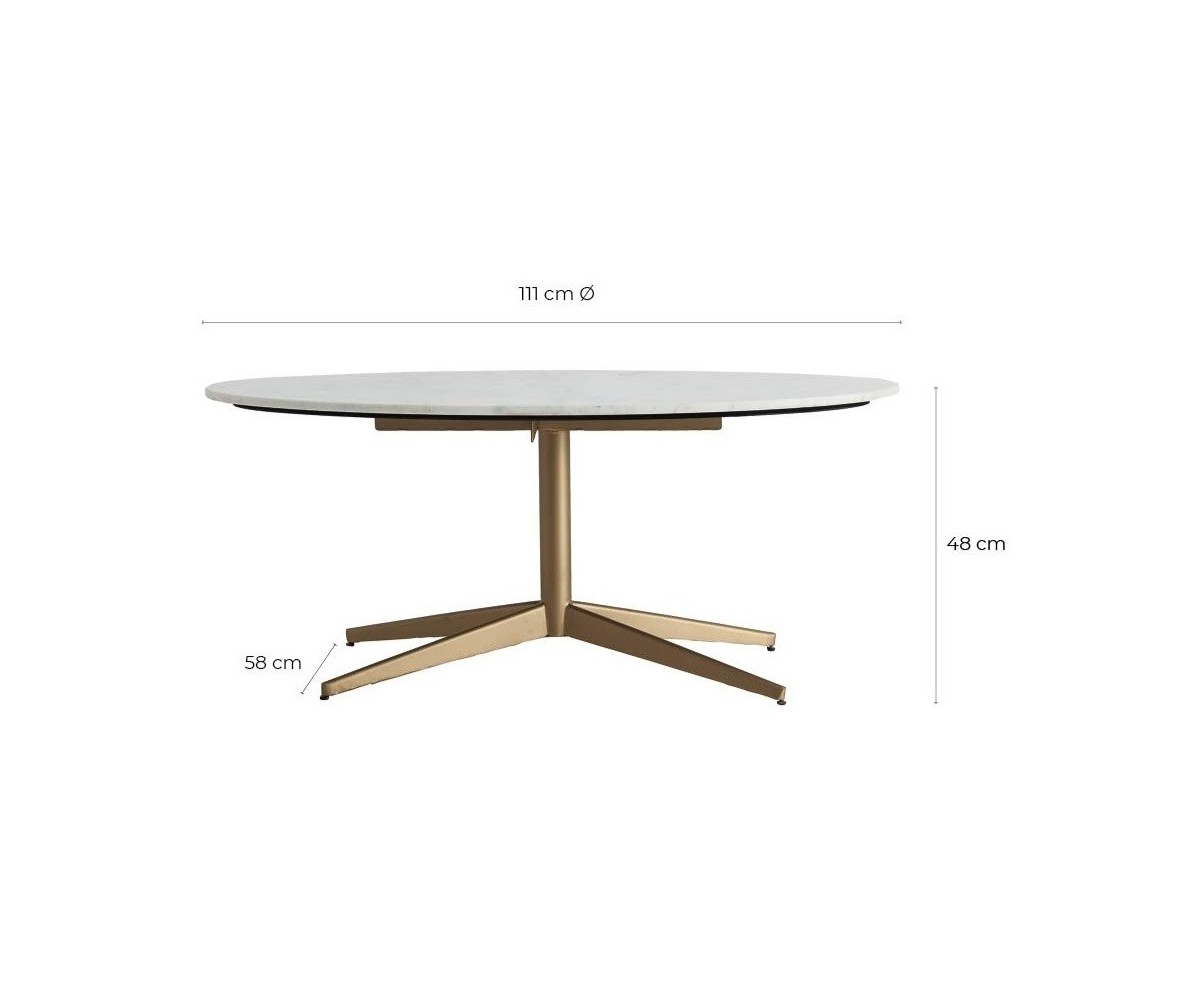 Mesa de centro circular inspirada en un diseño de Ignazio Gardella. Base con pie tubular y cuatro aspas en acero terminación dorado mate, sobre circular en mármol color blanco. Tambien disponible en mesa comedor. Réplica exacta con materiales originales de máxima calidad.