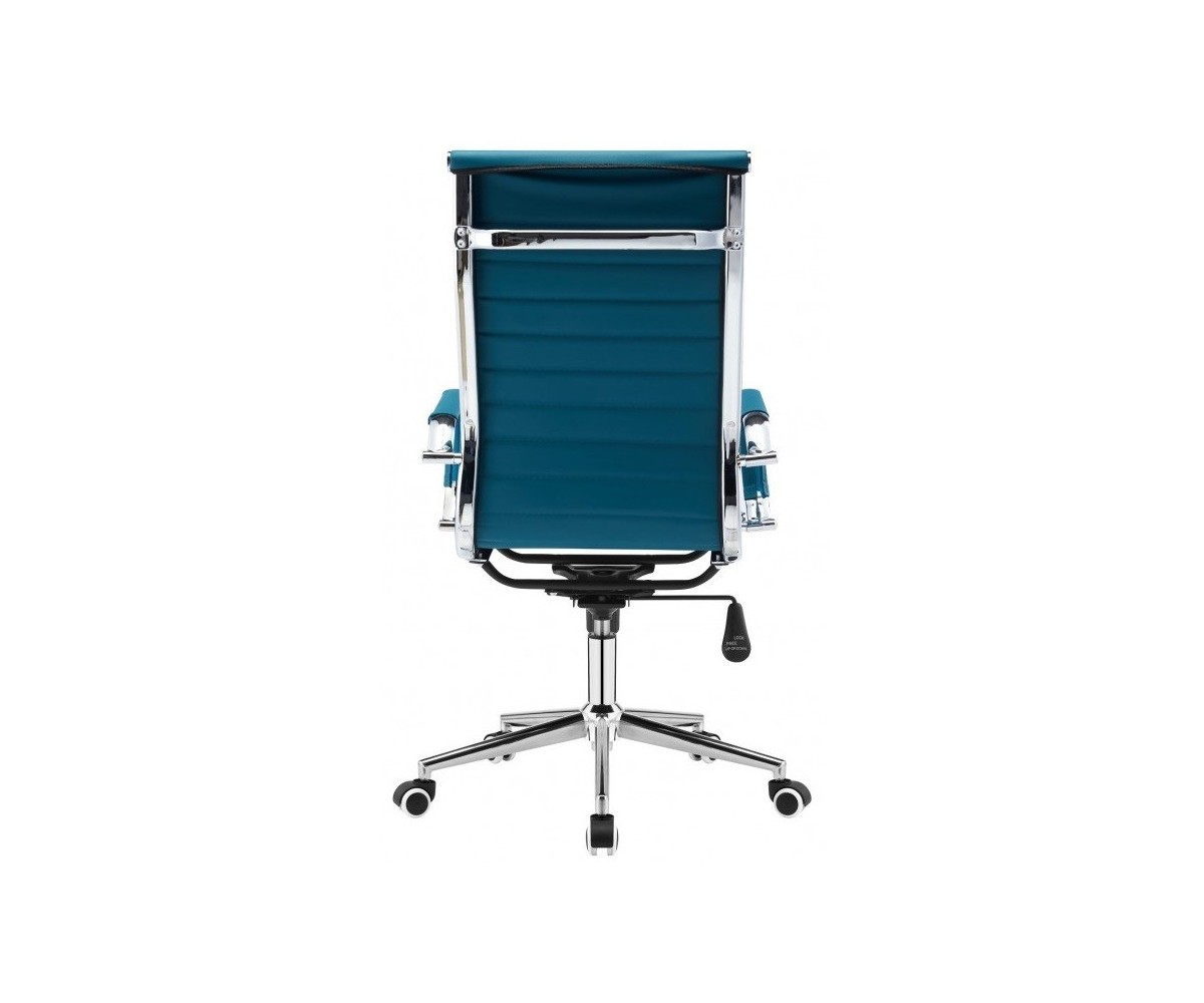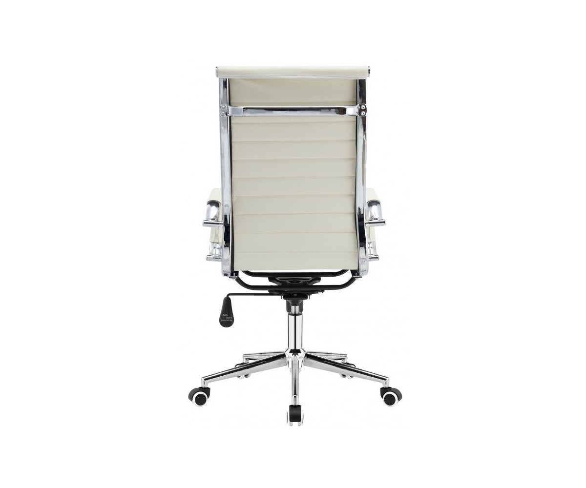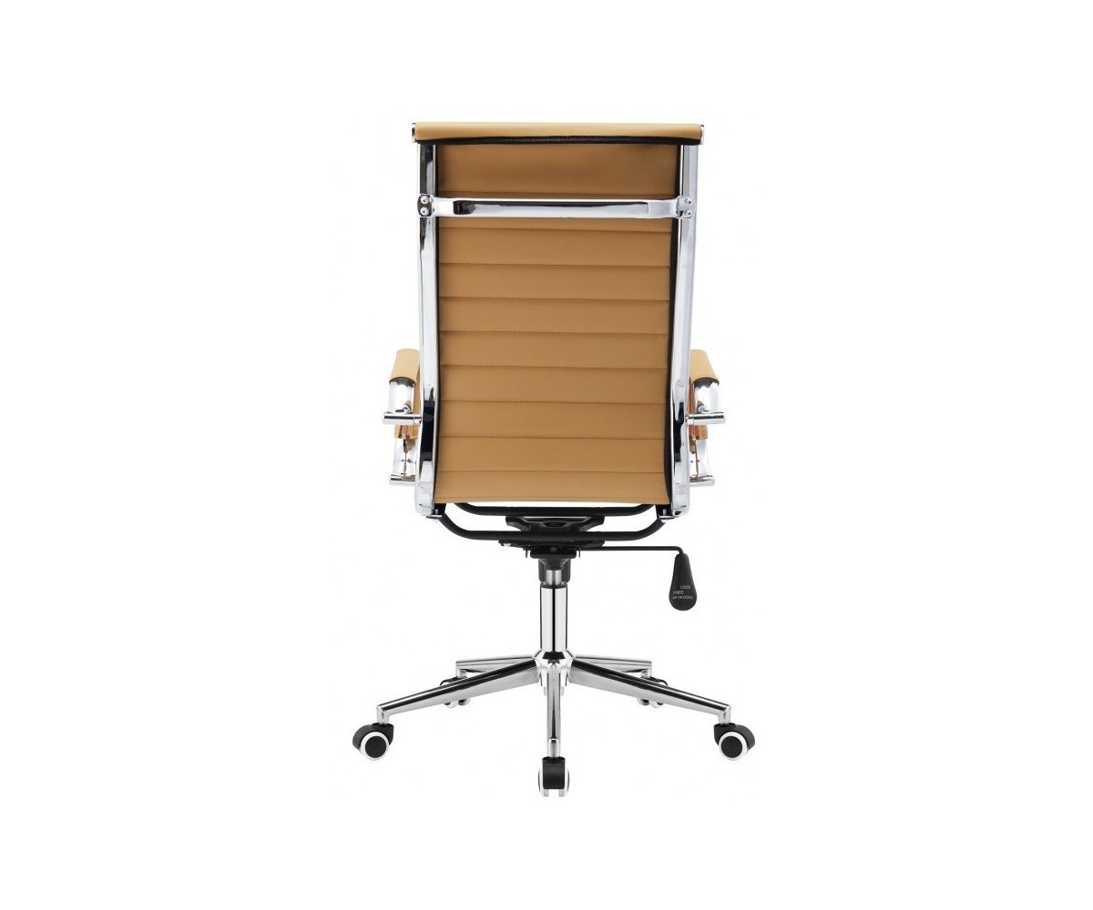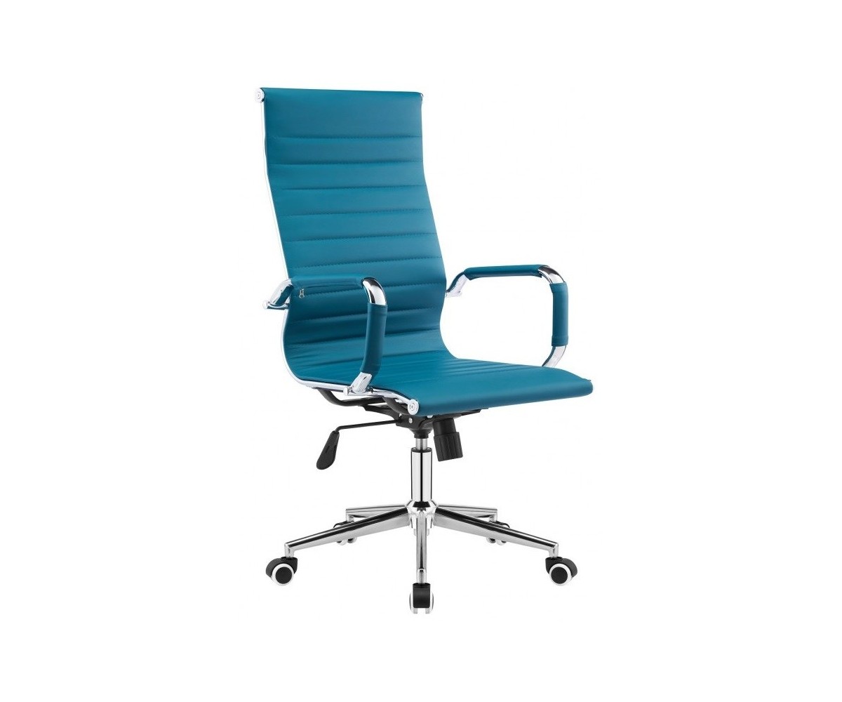 Silla de oficina giratoria inspirada en un diseño de Charles & Ray Eames. Armazón fabricado en acero terminación cromado, altura y inclinación del respaldo regulable mediante bomba de aire, carcasa con respaldo alto, asiento y respaldo tapizado en piel ecológica color azul, beige y marrón de gran dureza y durabilidad. Réplica exacta con materiales originales de máxima calidad.