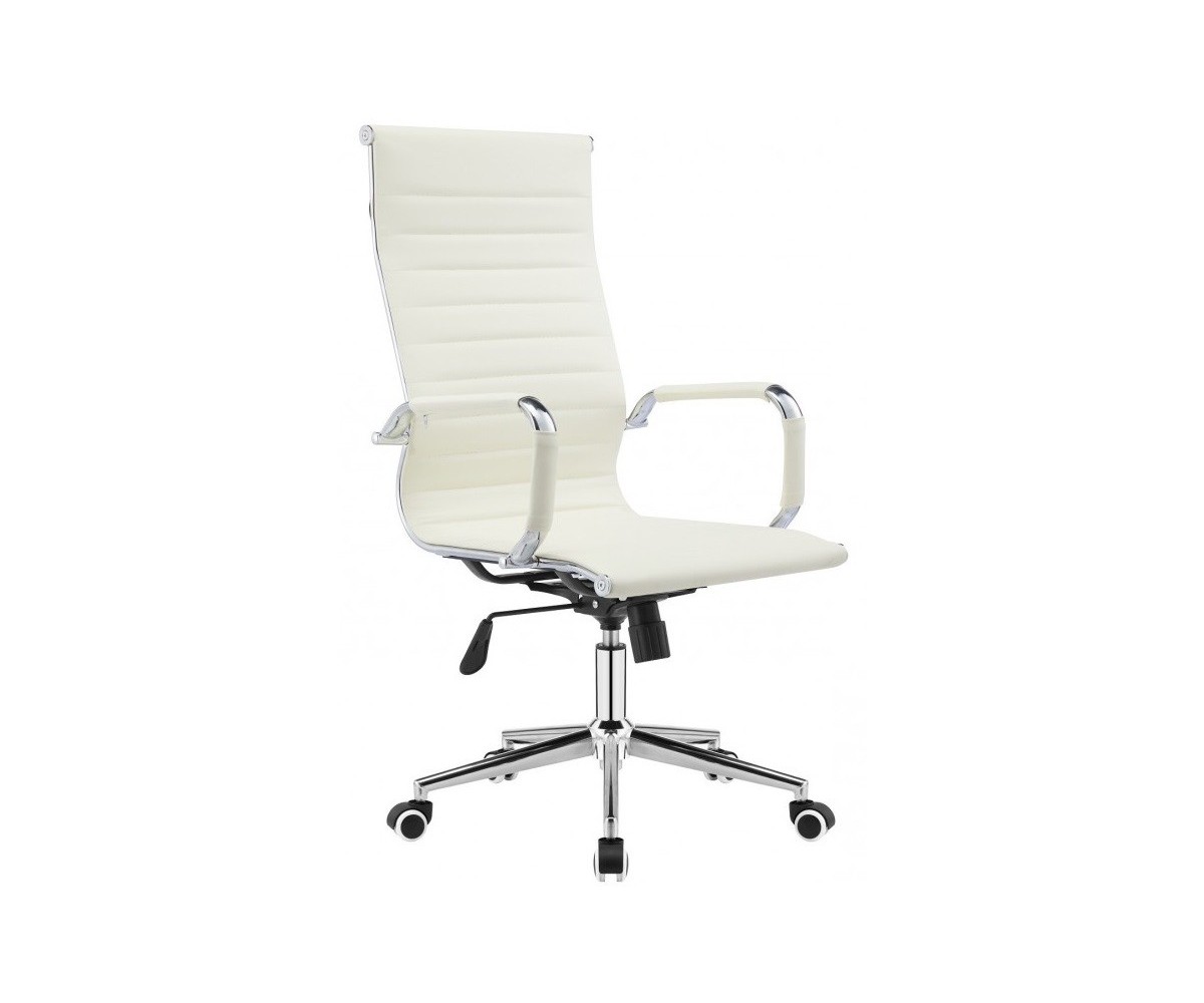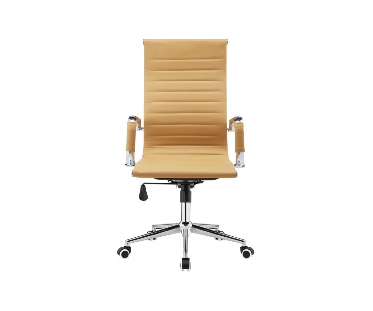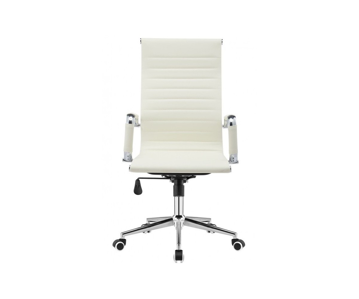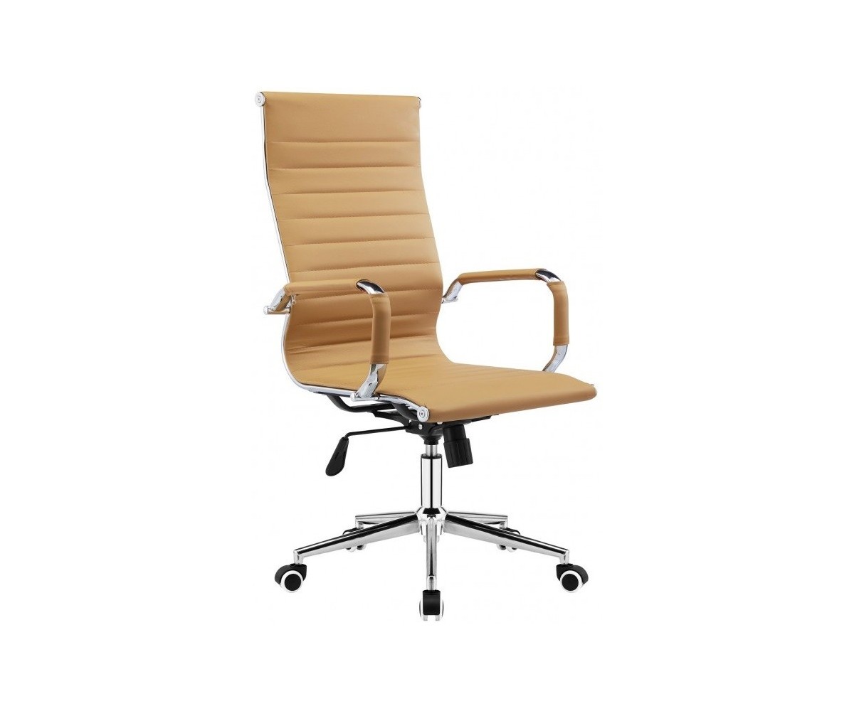 Silla de oficina giratoria inspirada en un diseño de Charles & Ray Eames. Armazón fabricado en acero terminación cromado, altura y inclinación del respaldo regulable mediante bomba de aire, carcasa con respaldo alto, asiento y respaldo tapizado en piel ecológica color azul, beige y marrón de gran dureza y durabilidad. Réplica exacta con materiales originales de máxima calidad.