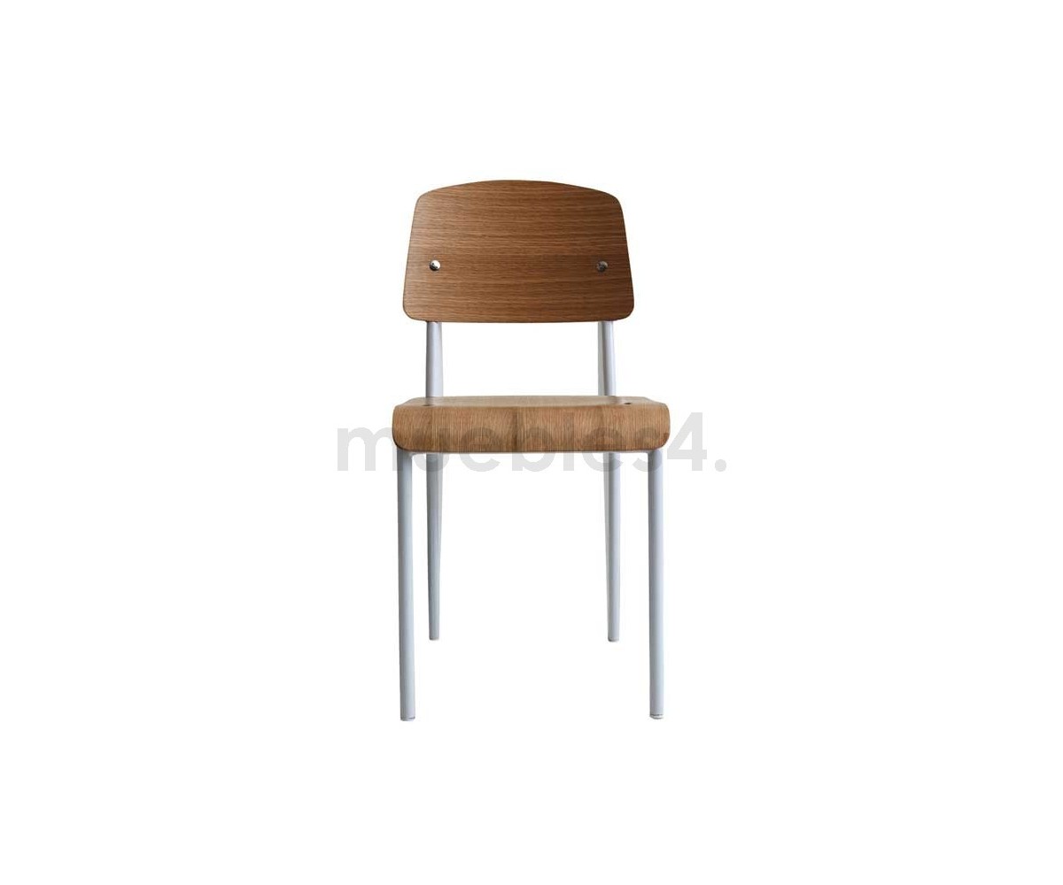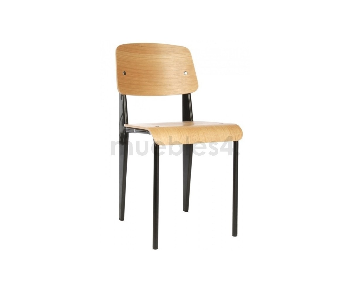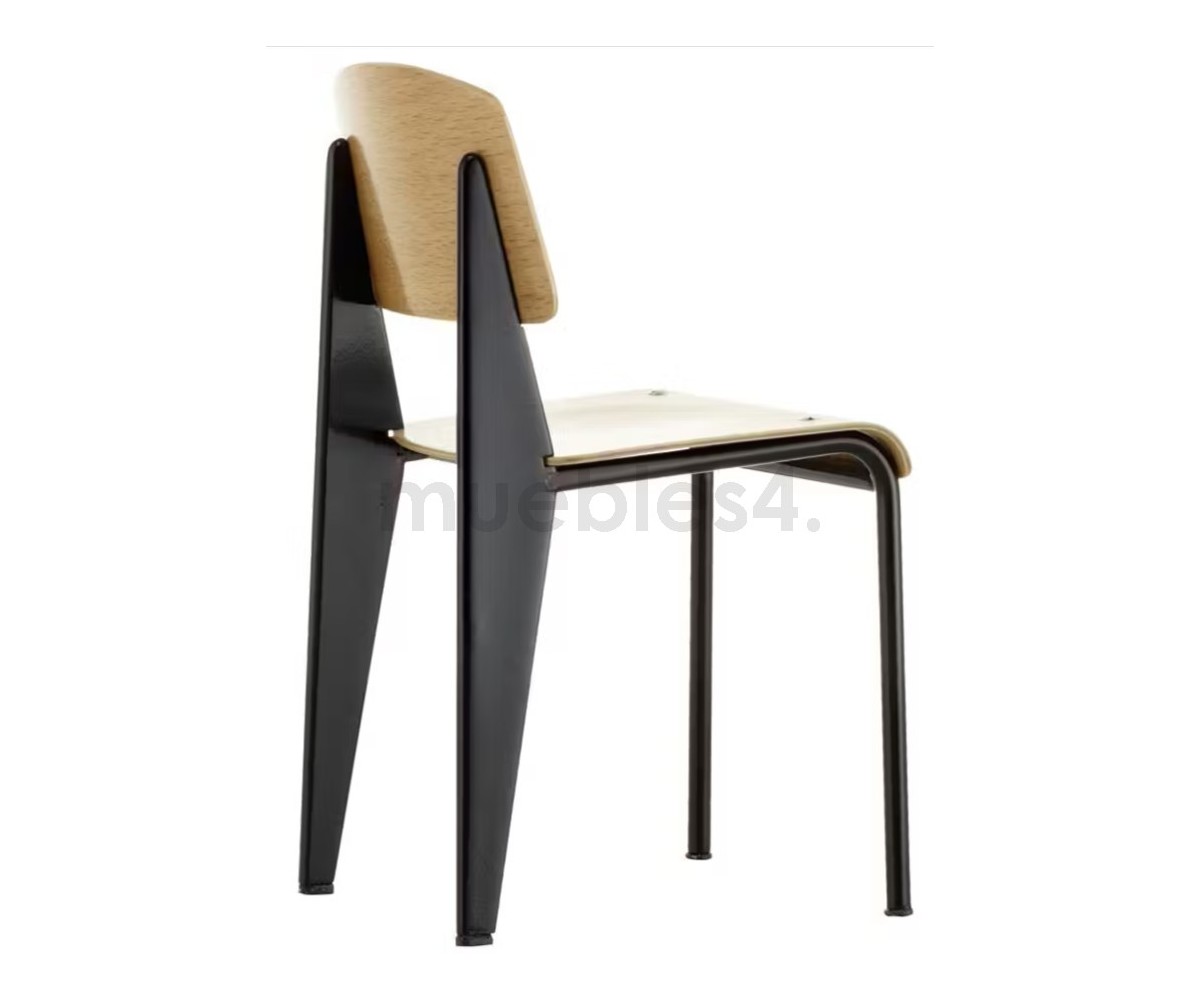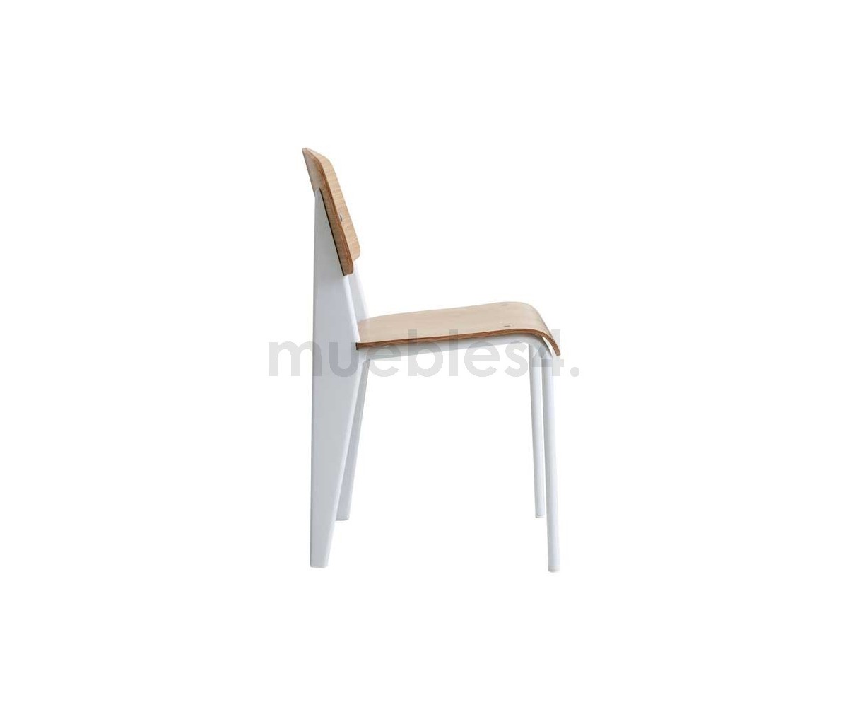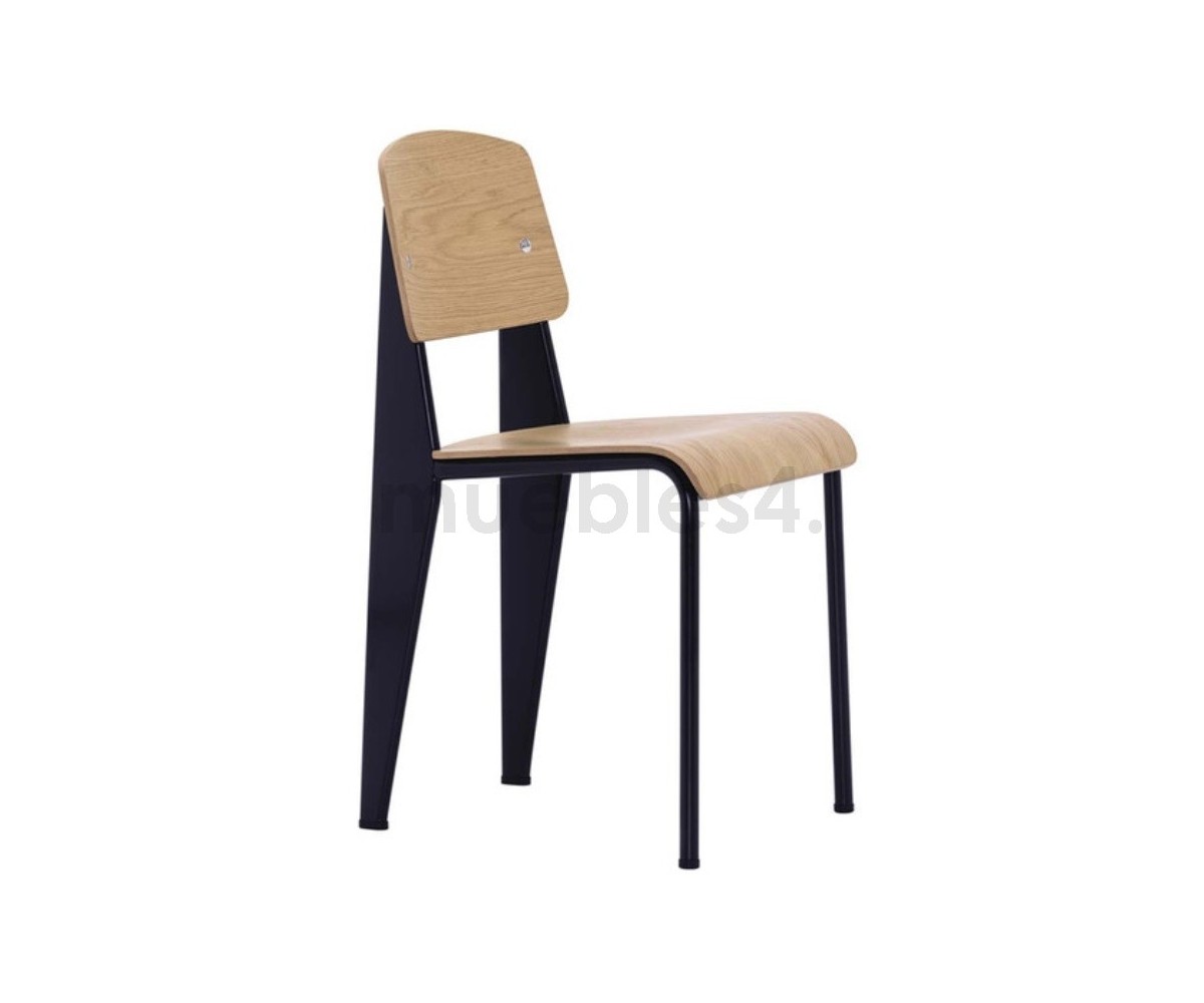 Silla, inspirada en un diseño de Jean Prouvé. La Standard Chair se ha convertido en uno de los clásicos más famosos del diseñador francés. La estructura metálica de esta icónica silla, está disponible en distintos colores. La silla esta pensada y fabricada para soportar mas carga en las patas traseras, donde debe sustentar el peso de la parte superior del cuerpo.
