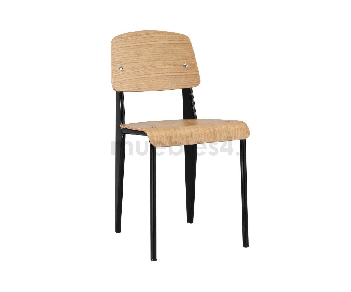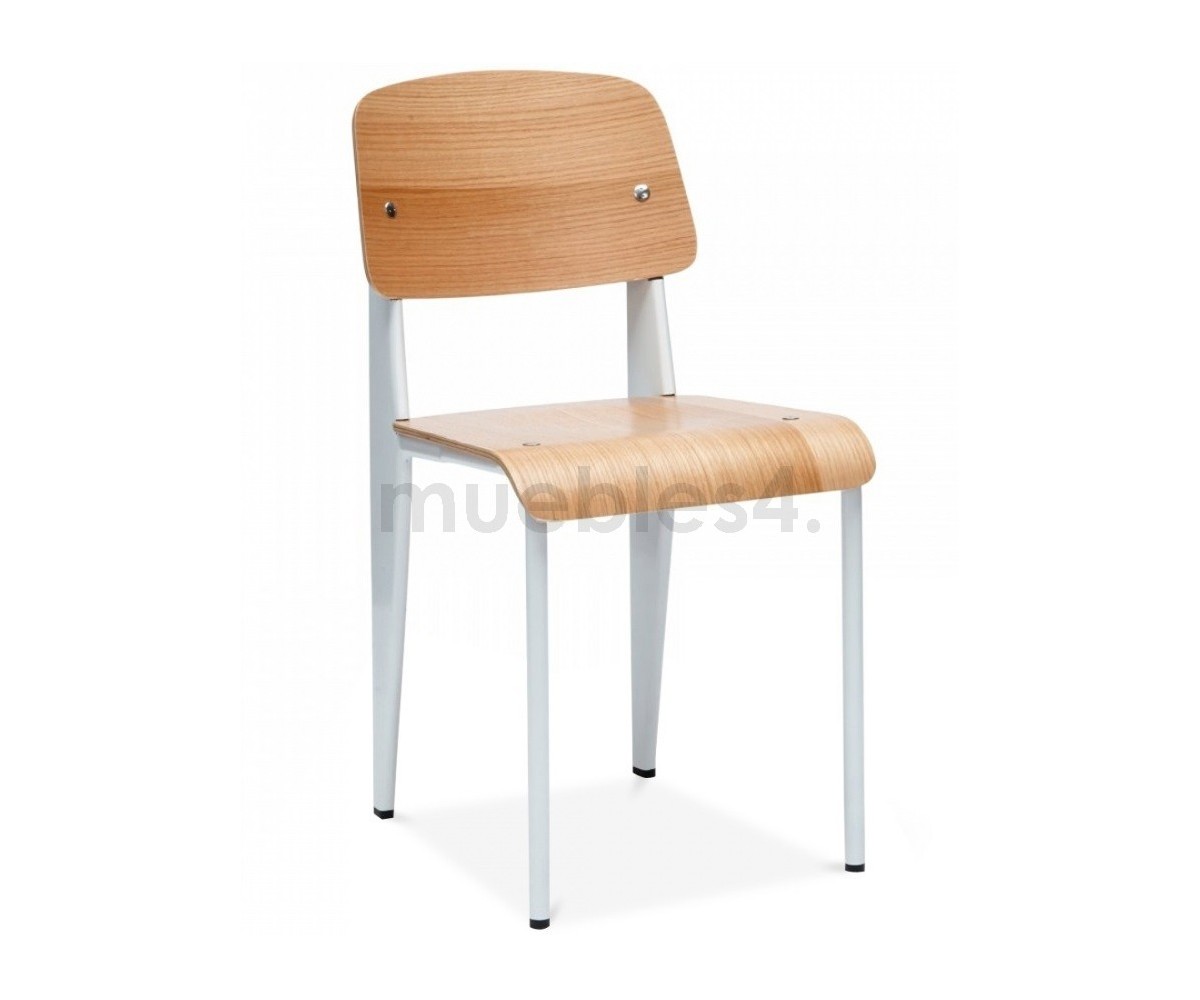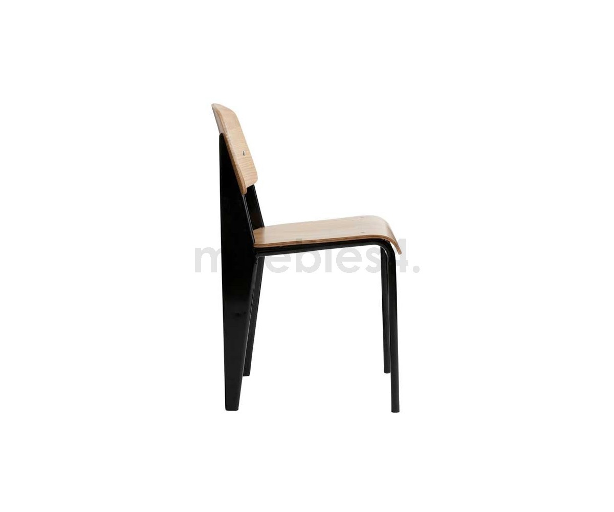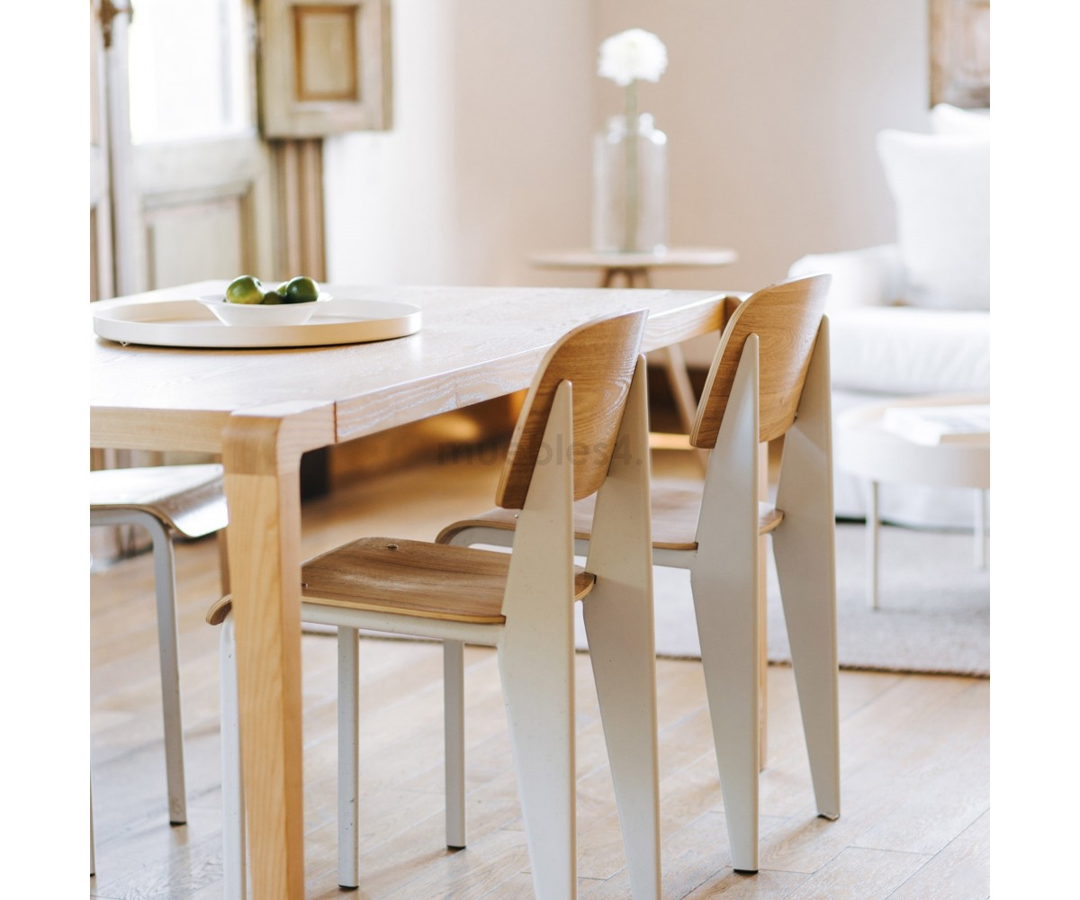 Silla, inspirada en un diseño de Jean Prouvé. La Standard Chair se ha convertido en uno de los clásicos más famosos del diseñador francés. La estructura metálica de esta icónica silla, está disponible en distintos colores. La silla esta pensada y fabricada para soportar mas carga en las patas traseras, donde debe sustentar el peso de la parte superior del cuerpo.