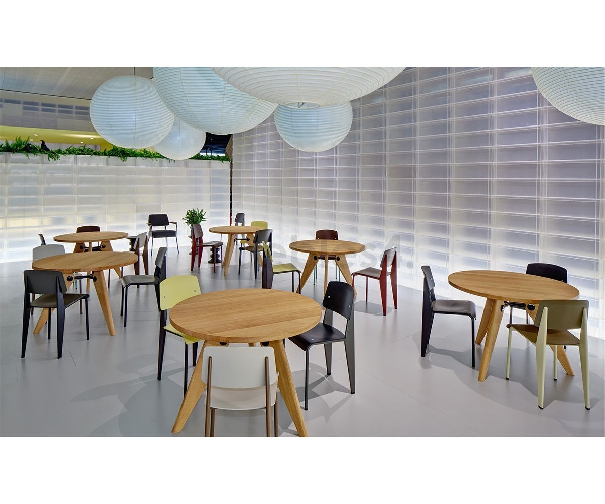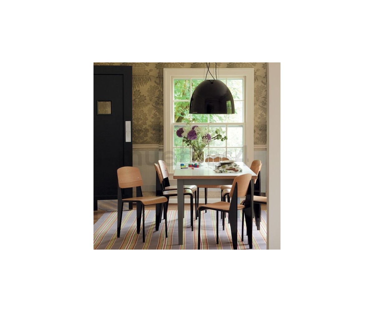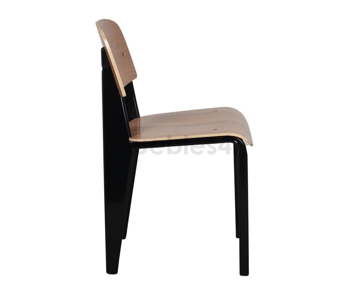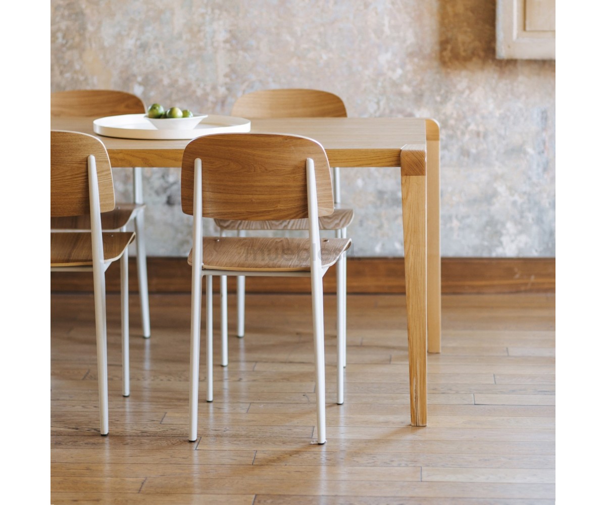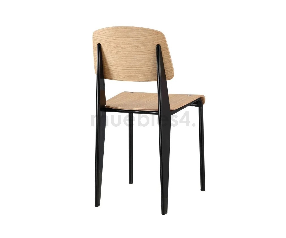 Silla, inspirada en un diseño de Jean Prouvé. La Standard Chair se ha convertido en uno de los clásicos más famosos del diseñador francés. La estructura metálica de esta icónica silla, está disponible en distintos colores. La silla esta pensada y fabricada para soportar mas carga en las patas traseras, donde debe sustentar el peso de la parte superior del cuerpo.