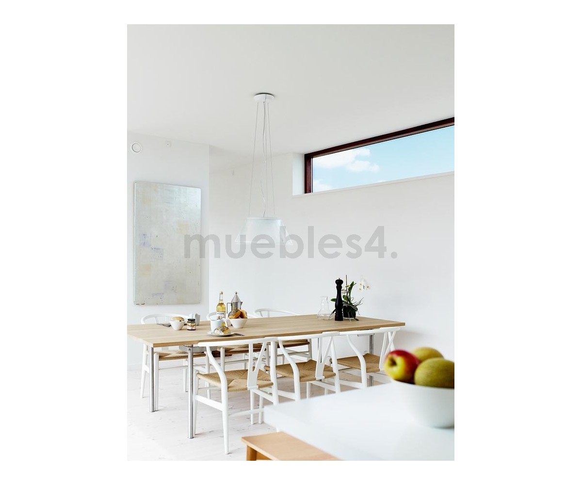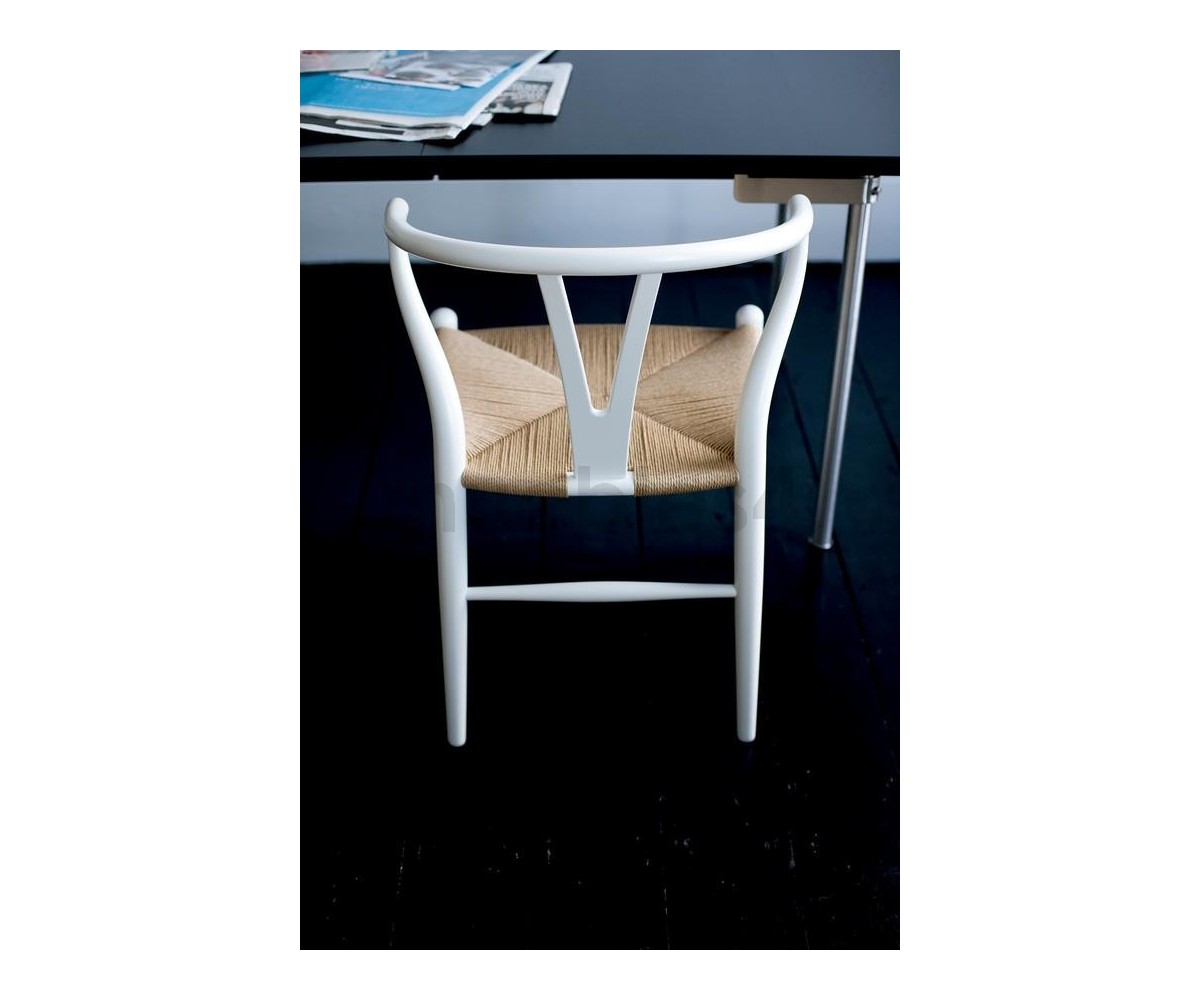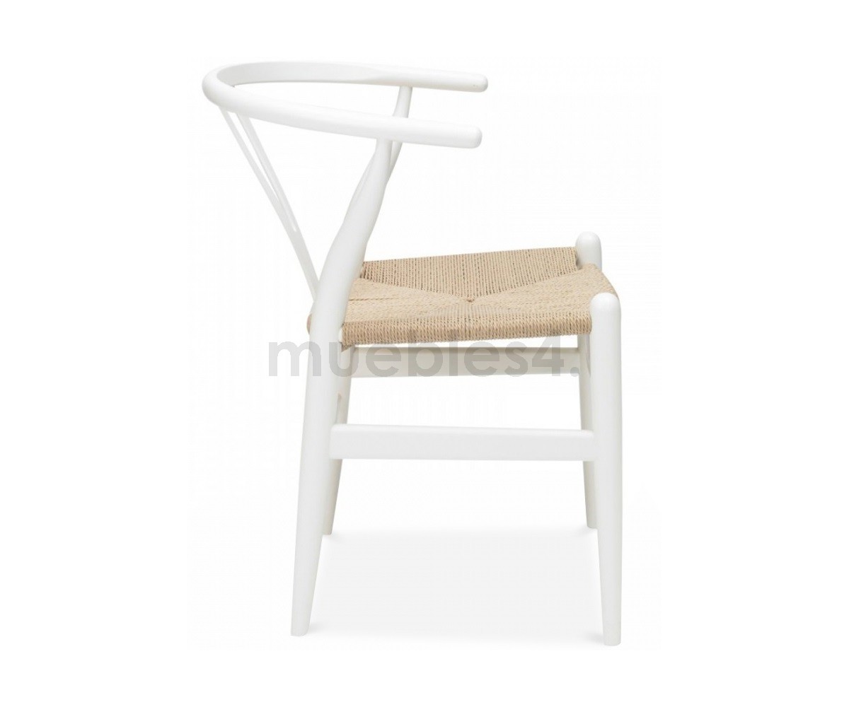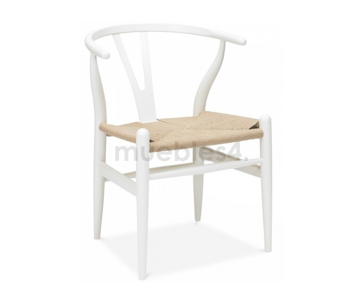 Silla inspirada en un diseño de Hans J. Wegner. Estructura fabricada en madera de roble lacado en color blanco, asiento trenzada en enea color natural. Réplica exacta con materiales originales de máxima calidad.