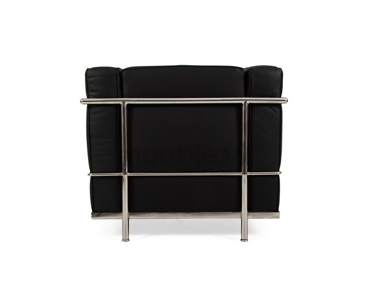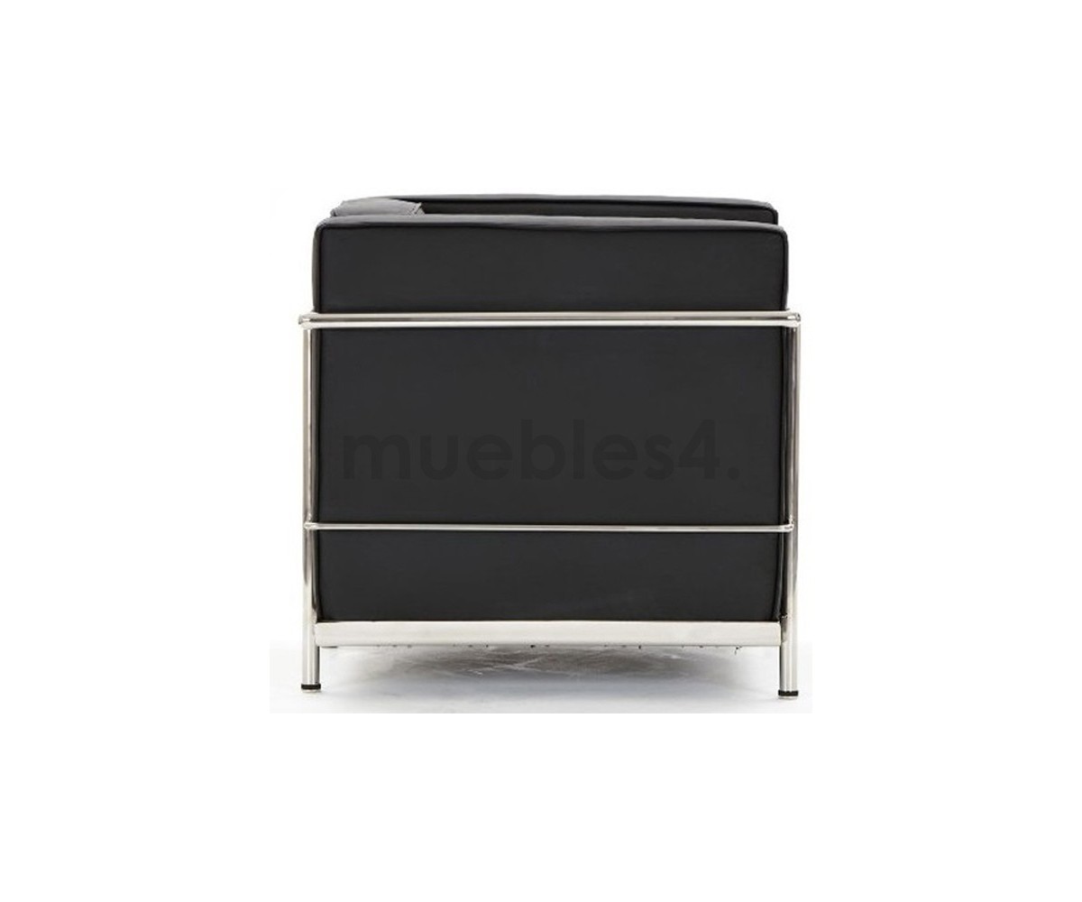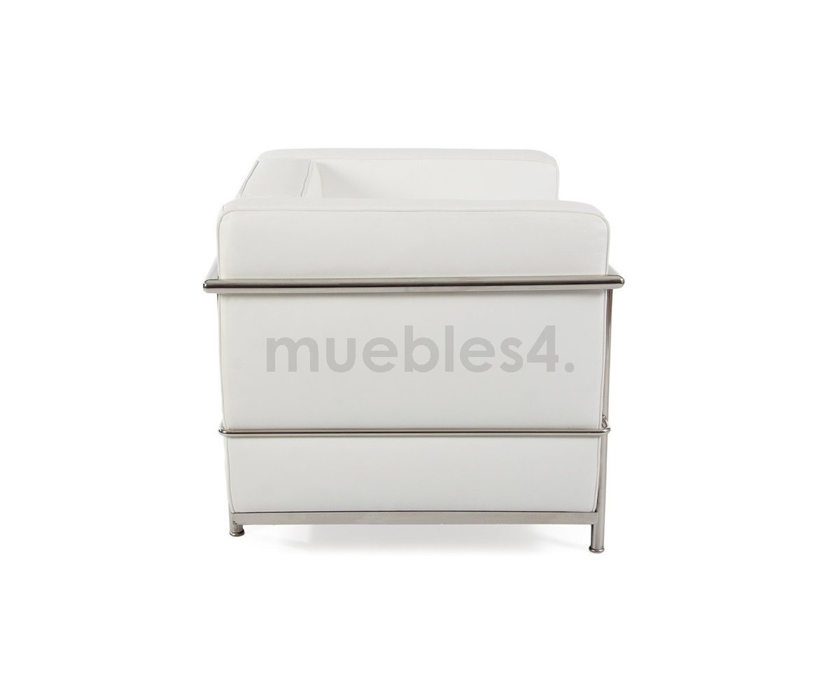 Sillón de 1 plaza inspirado en un diseño de Le Corbusier. Armazón inferior en acero cromado terinación brillo, laterales en acero tubular cromado terminación brillo. Asinto, respaldo y apoyabrazos fabricado con espuma de polipropileno de alta densidad indeformable, tapizado en piel ecológica color negro o blanco. Disponible 2 y 3 plazas. Réplica exacta con materiales originales de máxima calidad.