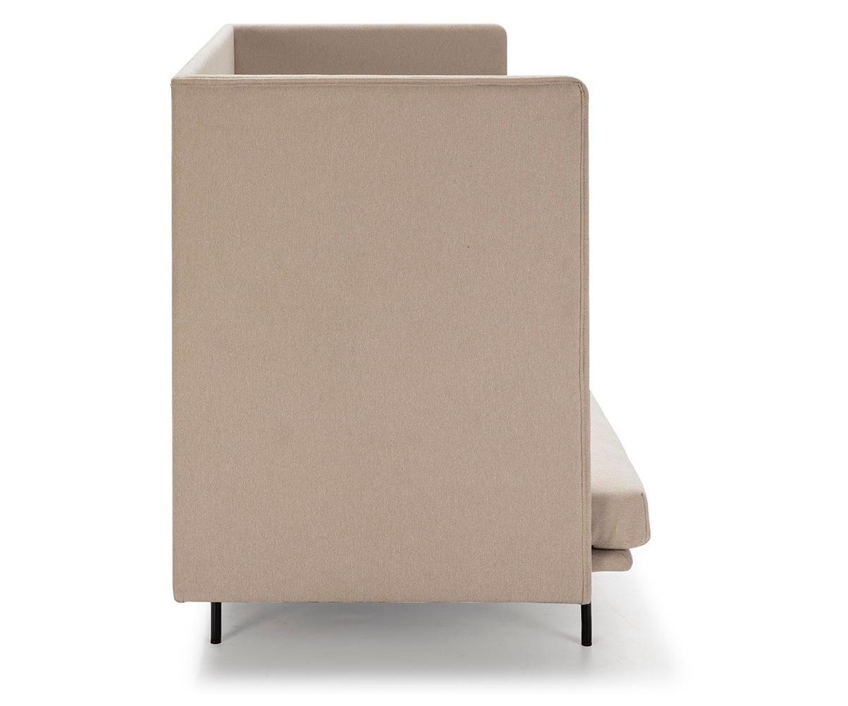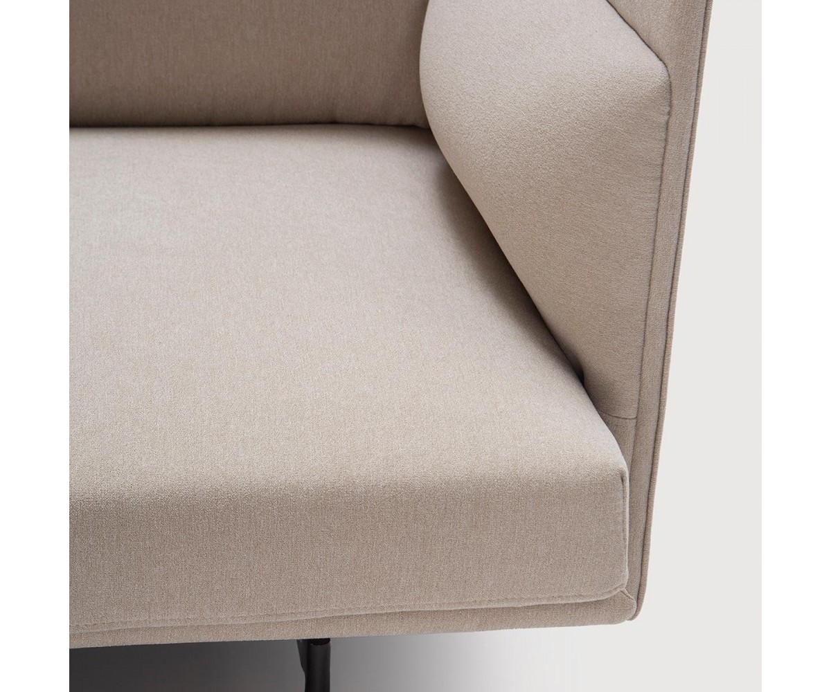 Sofá inspirado en un diseño de Anderssen & Voll. Estructura en acero y madera maciza de roble, con espuma HR 30kg/m3. Almohada asiento de espuma HR 32kg/m3, más 3cm de suplemento super suave. Almohada respaldo 100% fibra de poliéster siliconada, con funda interior con separadores para evitar que se deforme. Tapizado en tela clase A color crema. Patas en acero lacado al horno. Réplica exacta con materiales originales de máxima calidad.